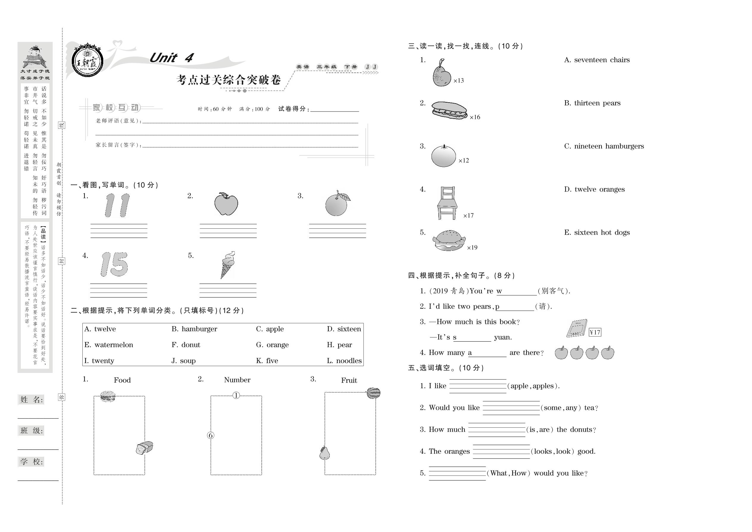 2021下册三年级英语冀教版 Unit 4 考点过关综合突破卷