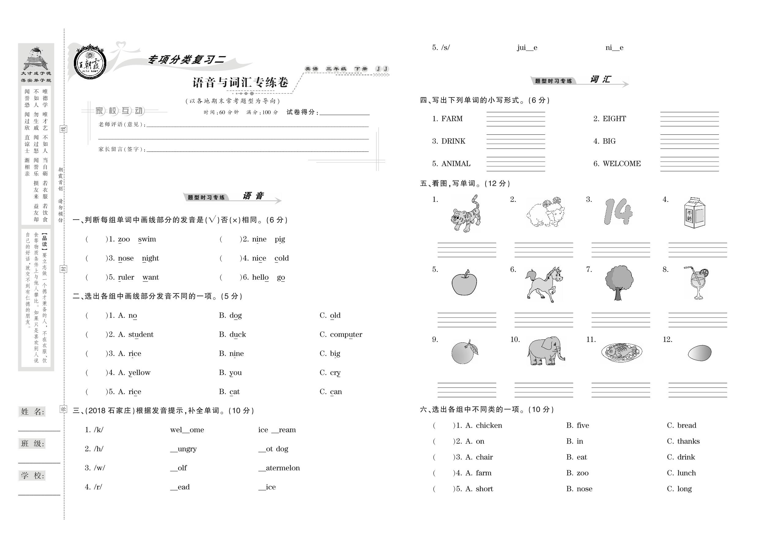 2021下册三年级英语冀教版 语音与词汇专练卷