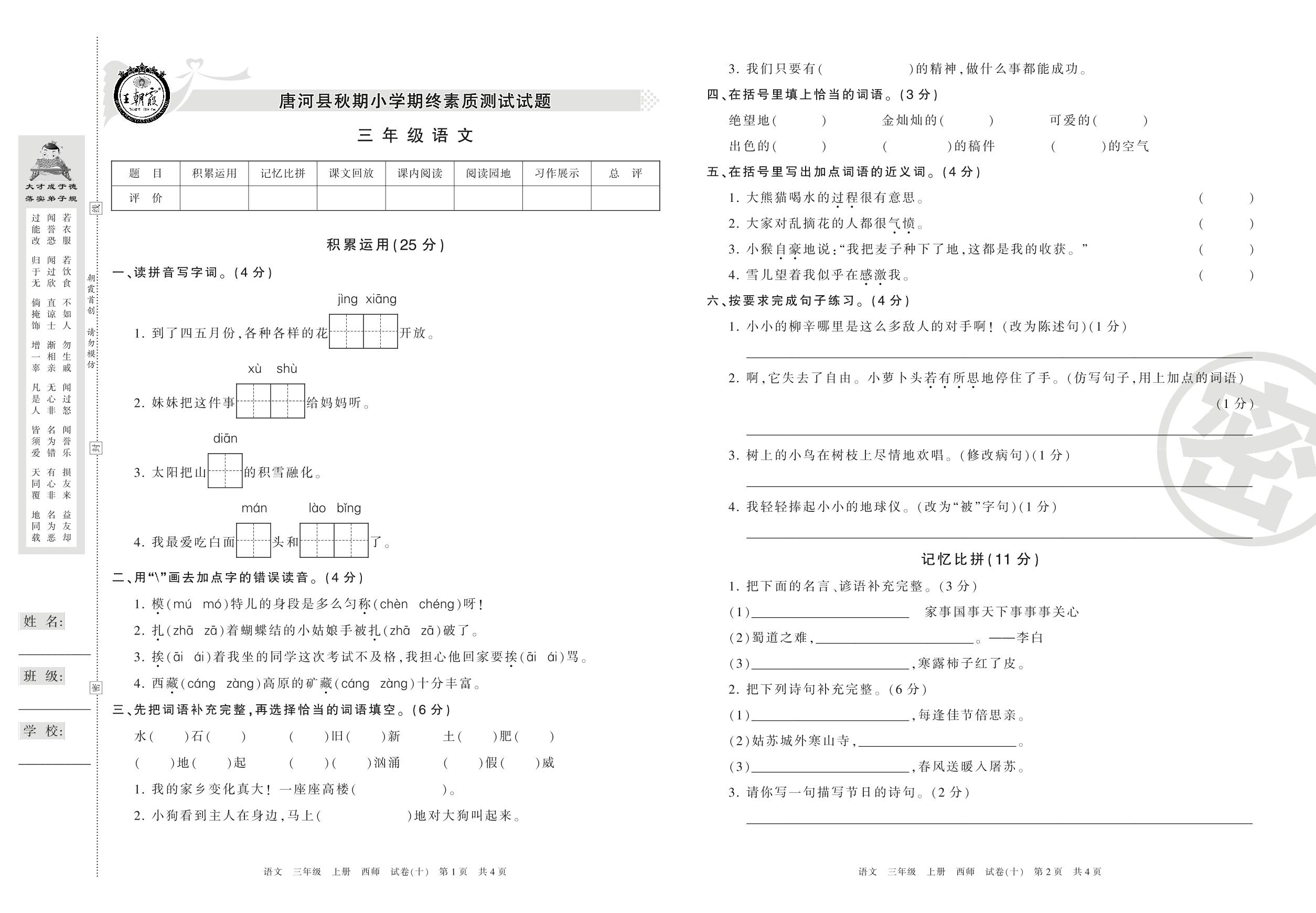 三年级语文西师版上册期末卷