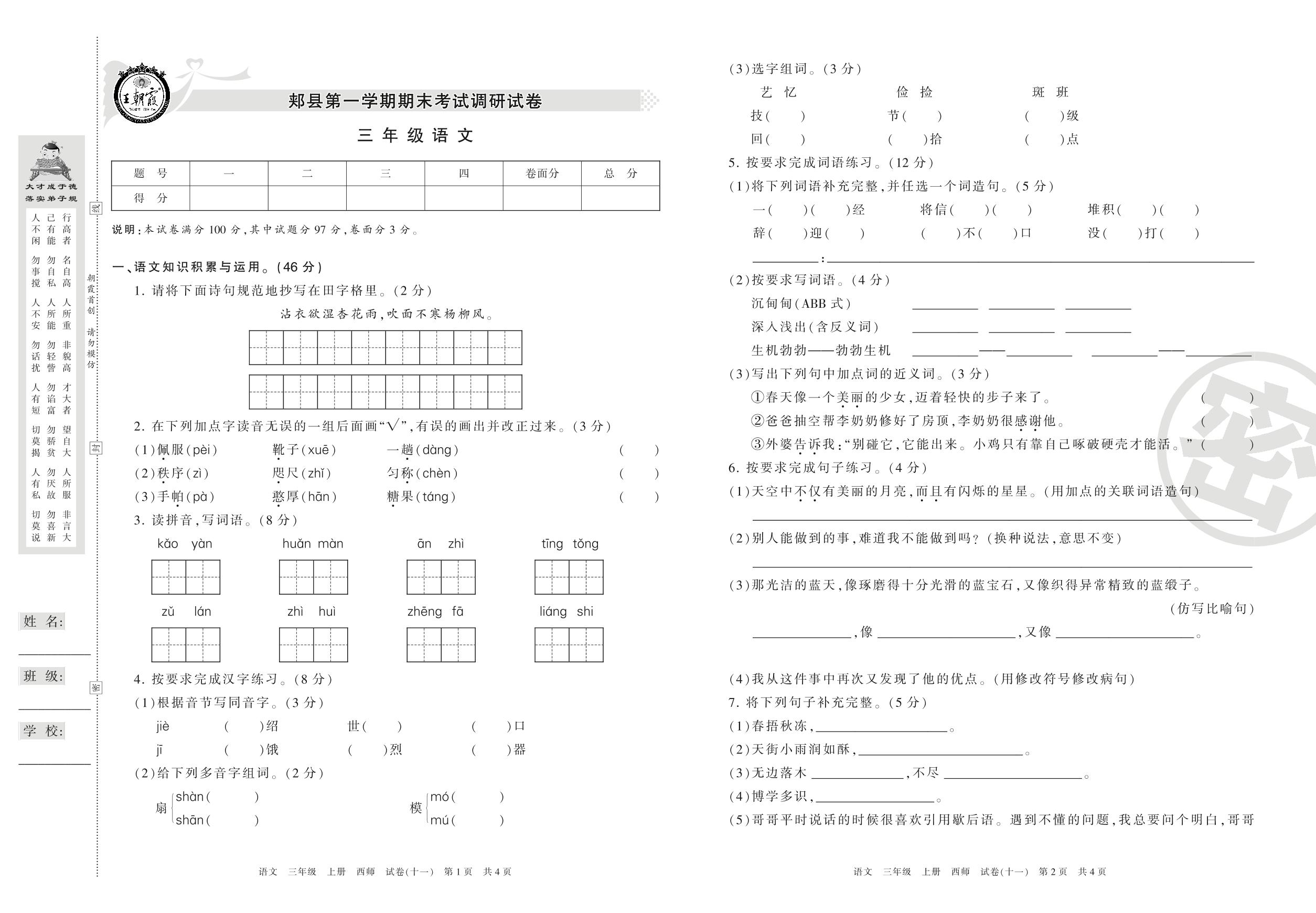 2016-2017学年第一学期平顶山市郏县三年级语文试卷(西师版)【11】