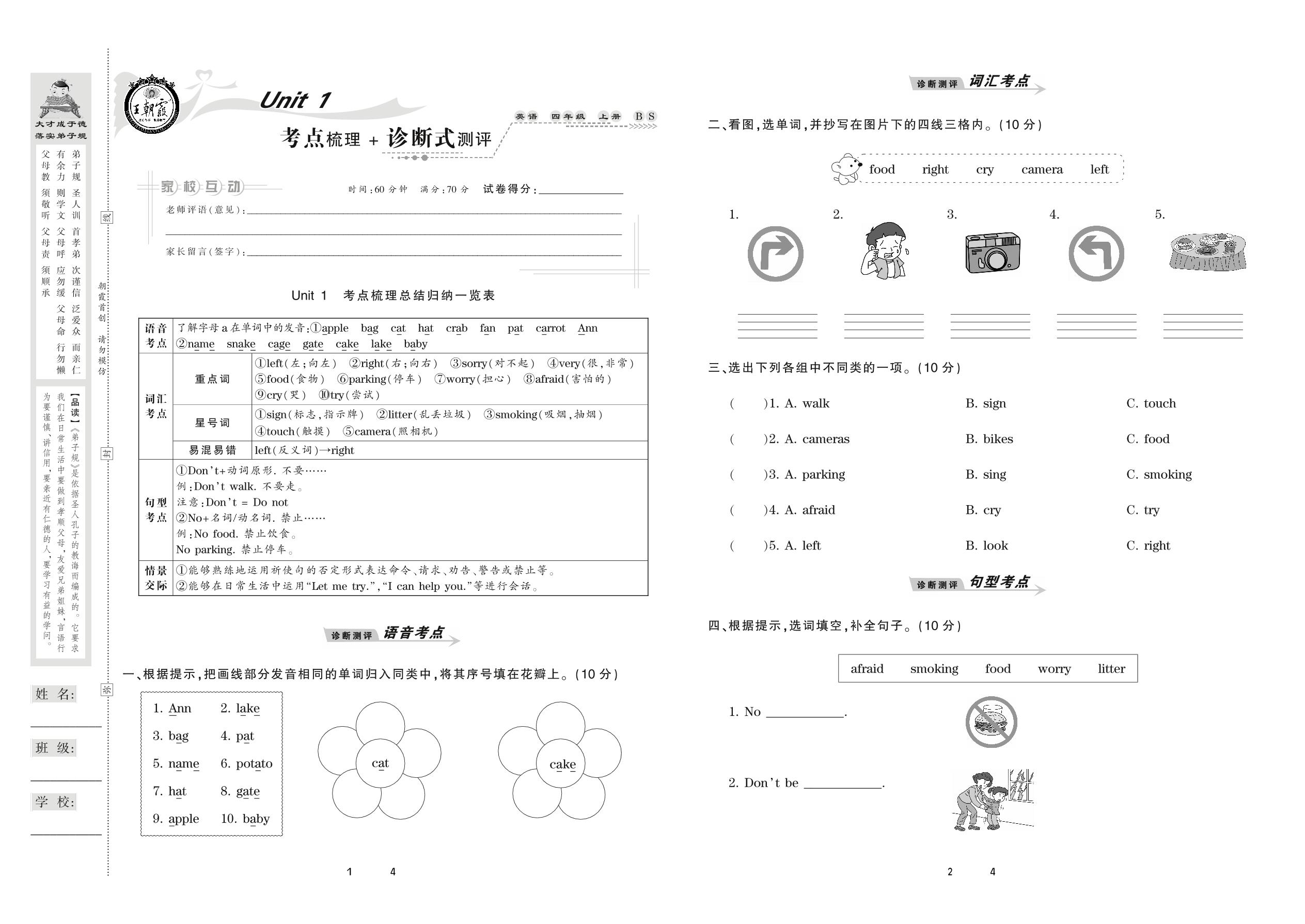 2020上册四年级英语北师版 Unit 1 考点梳理+诊断式测评