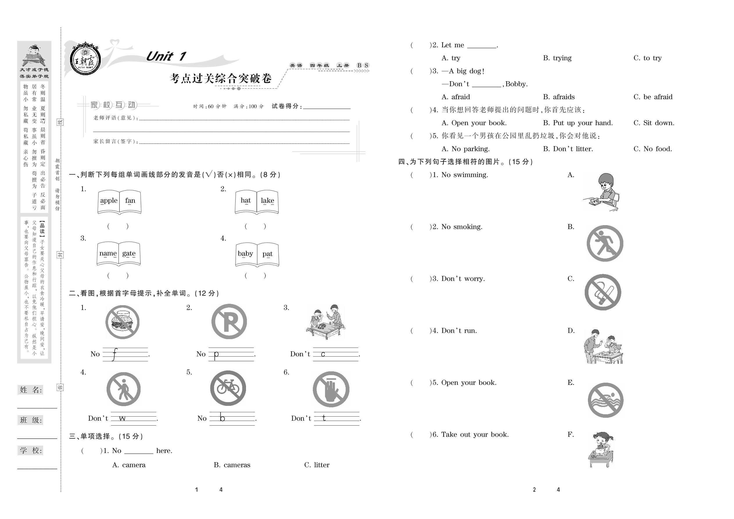 2020上册四年级英语北师版 Unit 1 考点过关综合突破卷
