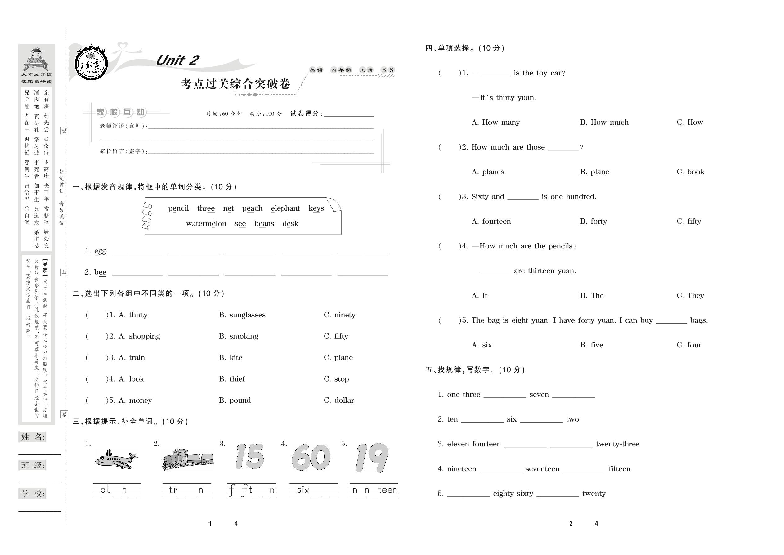 2020上册四年级英语北师版 Unit 2 考点过关综合突破卷