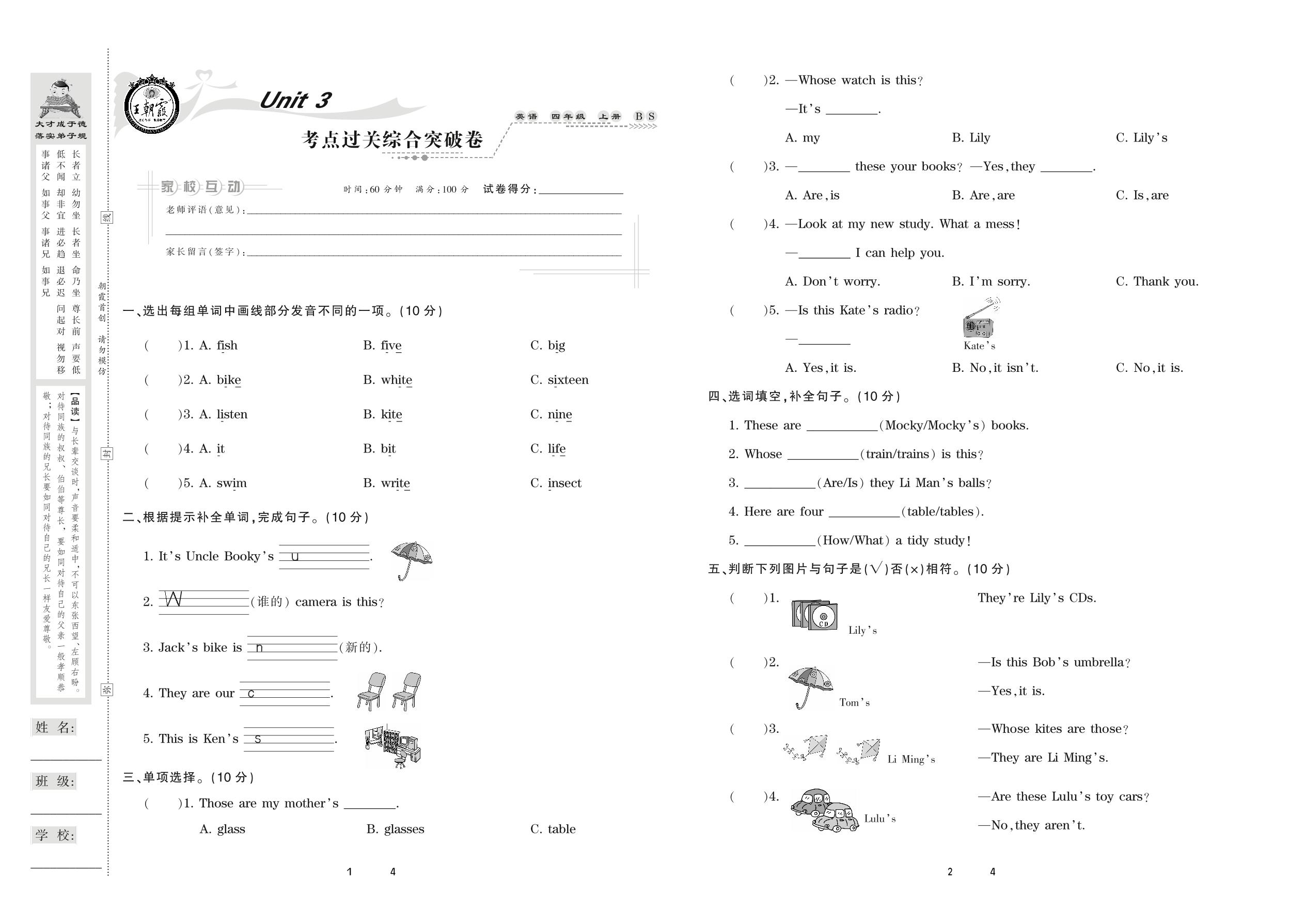 2020上册四年级英语北师版 Unit 3 考点过关综合突破卷