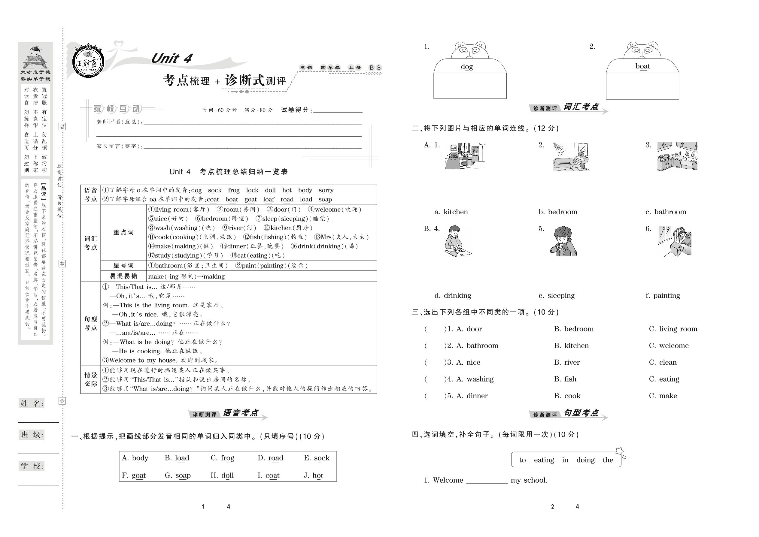 2020上册四年级英语北师版 Unit 4 考点梳理+诊断式测评