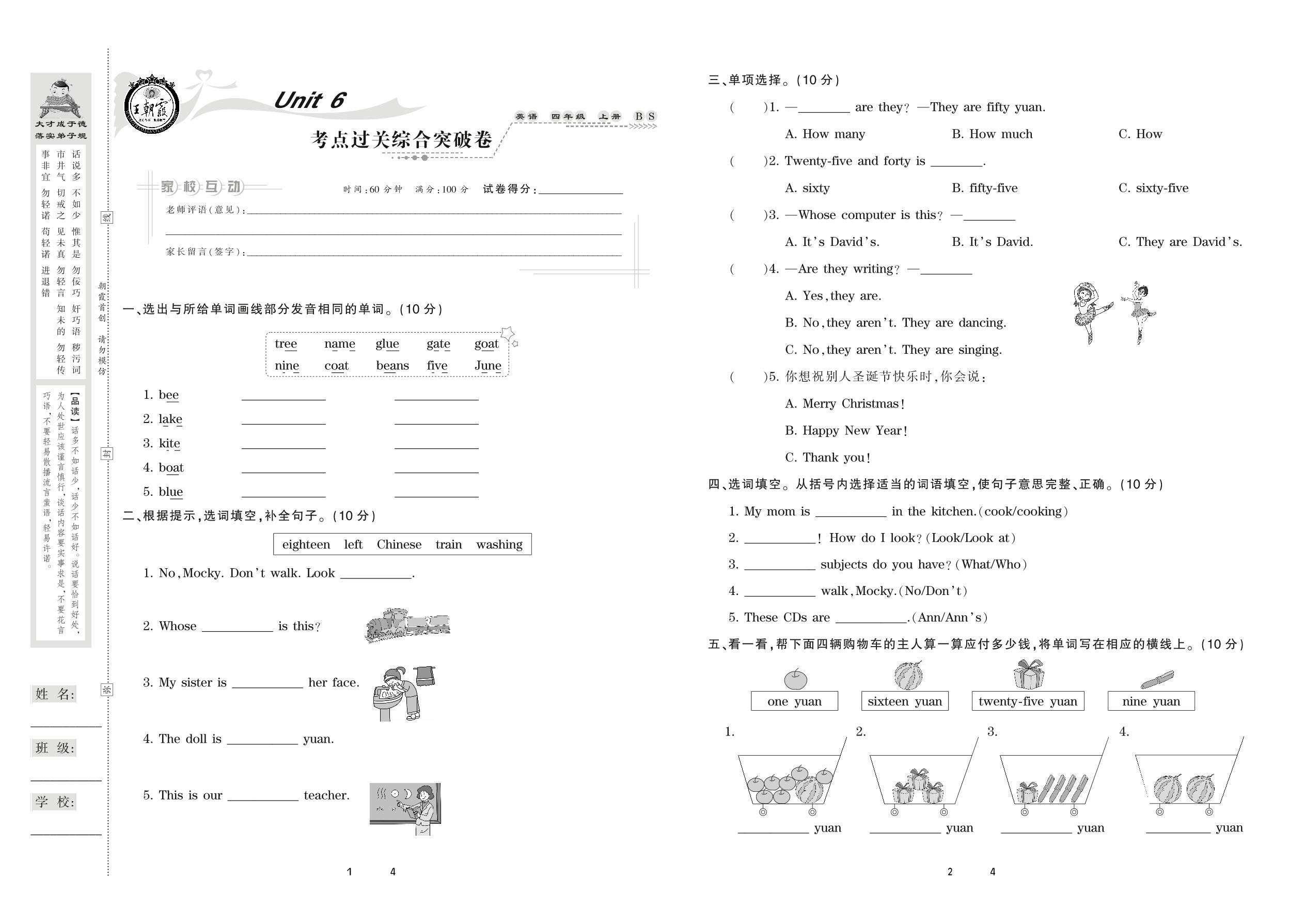 2020上册四年级英语北师版 Unit 6 考点过关综合突破卷