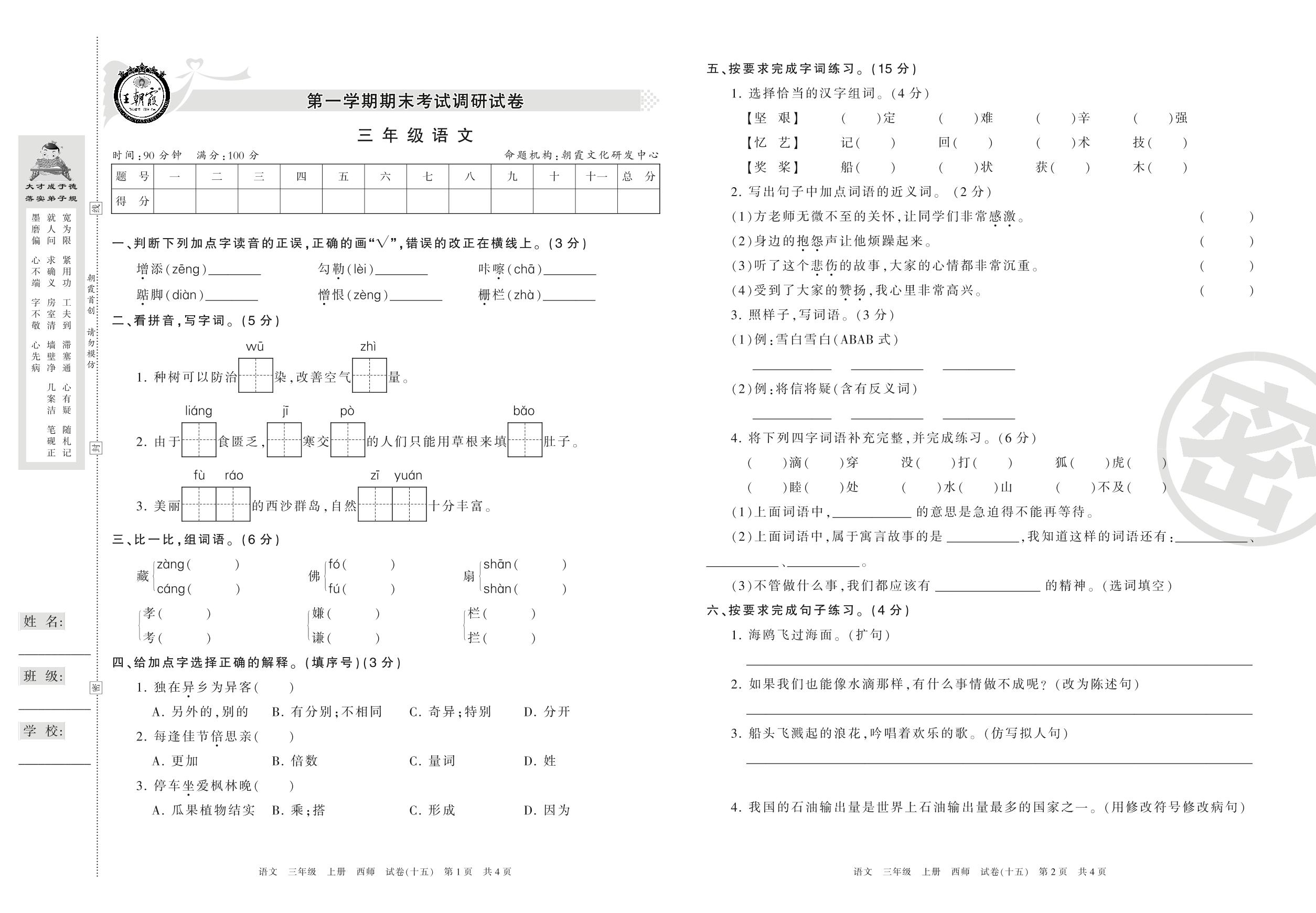第一学期期末考试调研试卷三年级上册语文(西师版)【15】