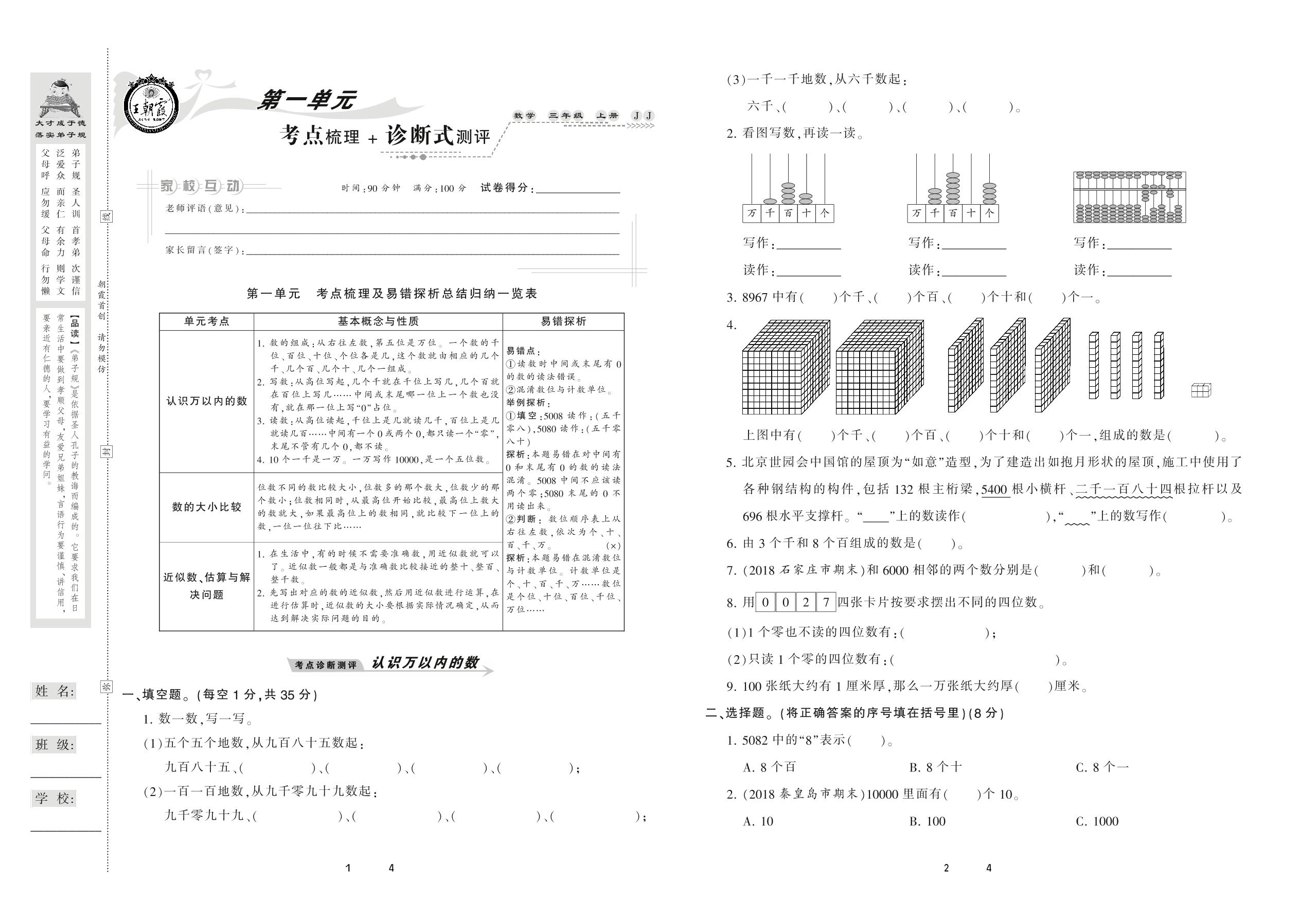 2020上册三年级数学冀教版 第一单元 考点梳理+诊断式测评