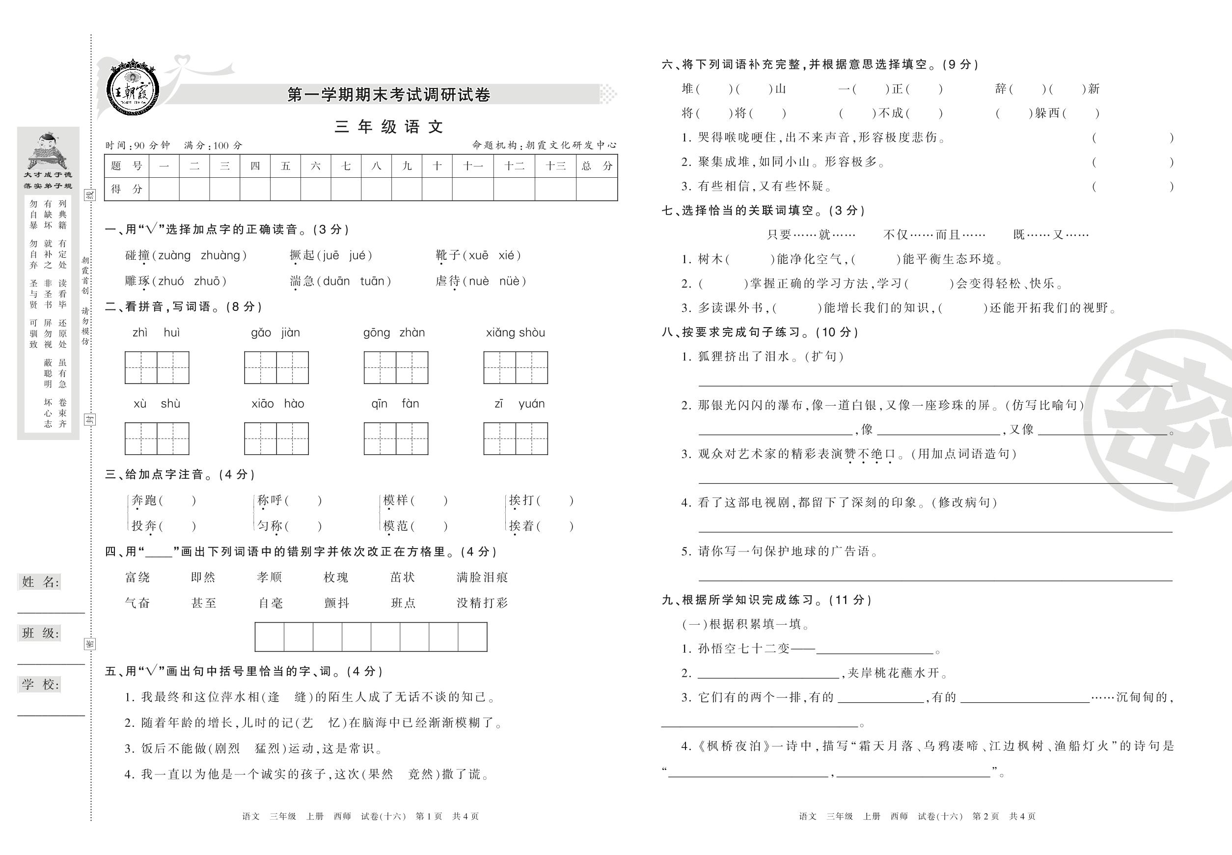 第一学期期末考试调研试卷三年级上册语文(西师版)【16】