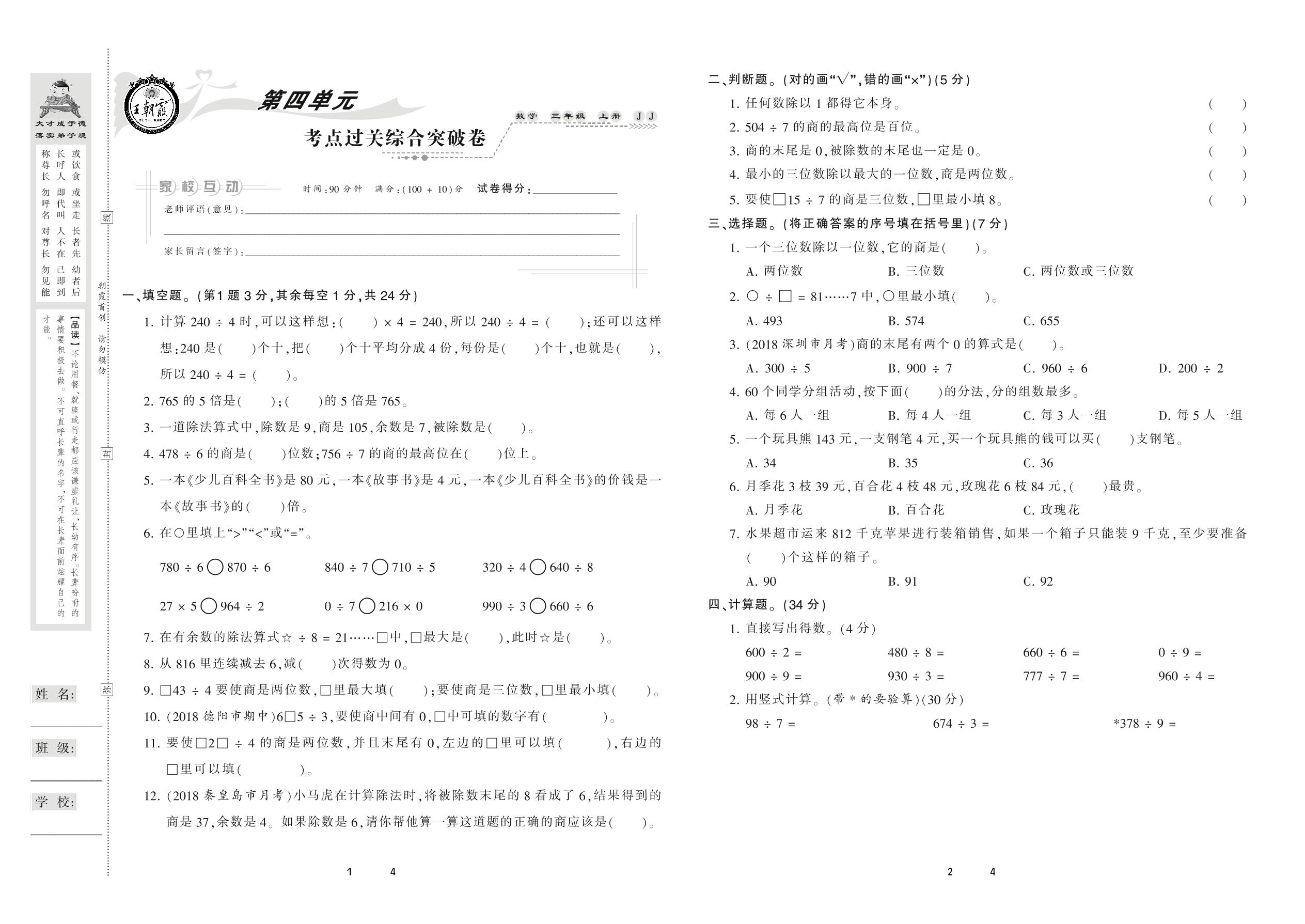 2020上册三年级数学冀教版 第四单元 考点过关综合突破卷