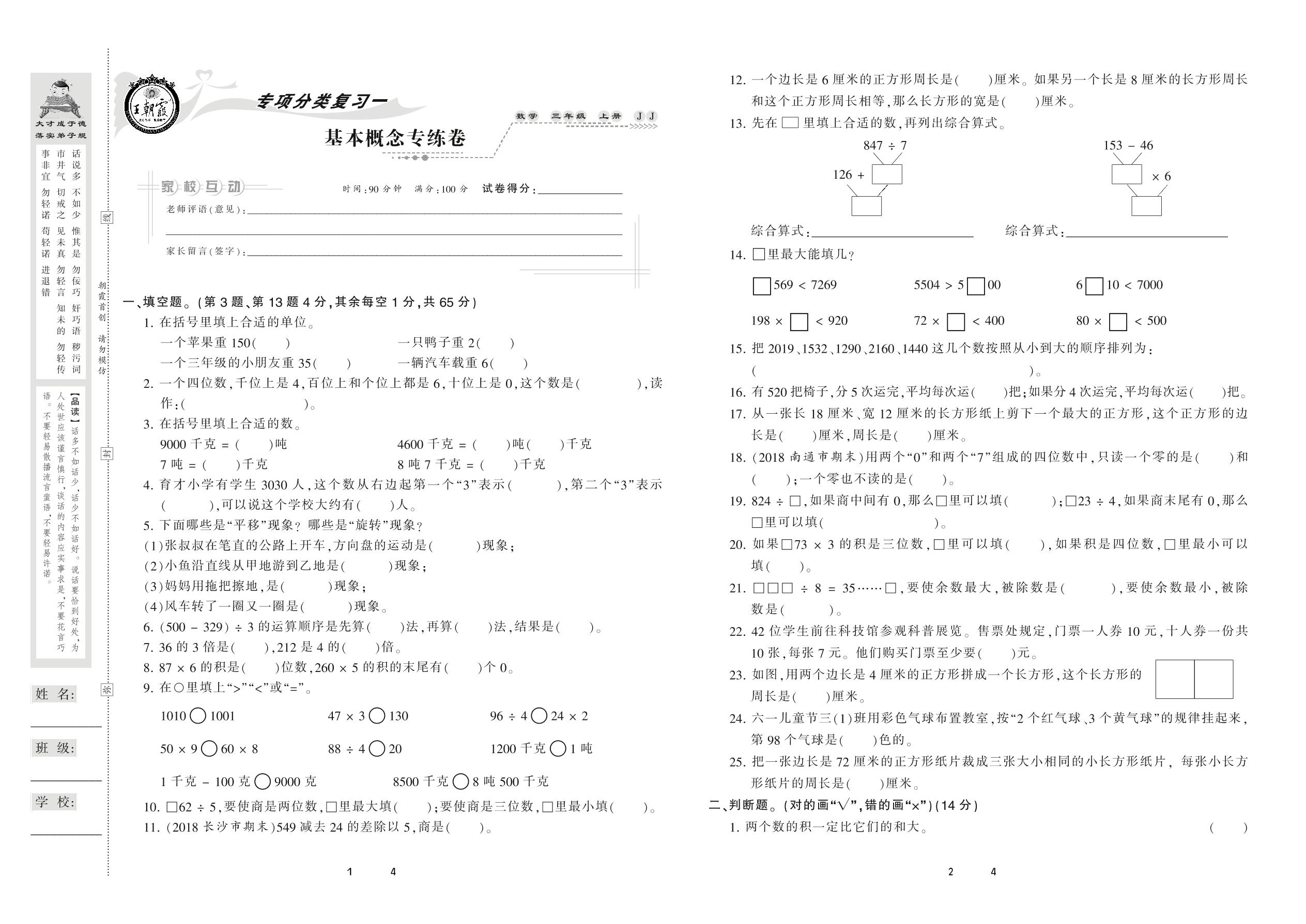 2020上册三年级数学冀教版 基本概念专练卷