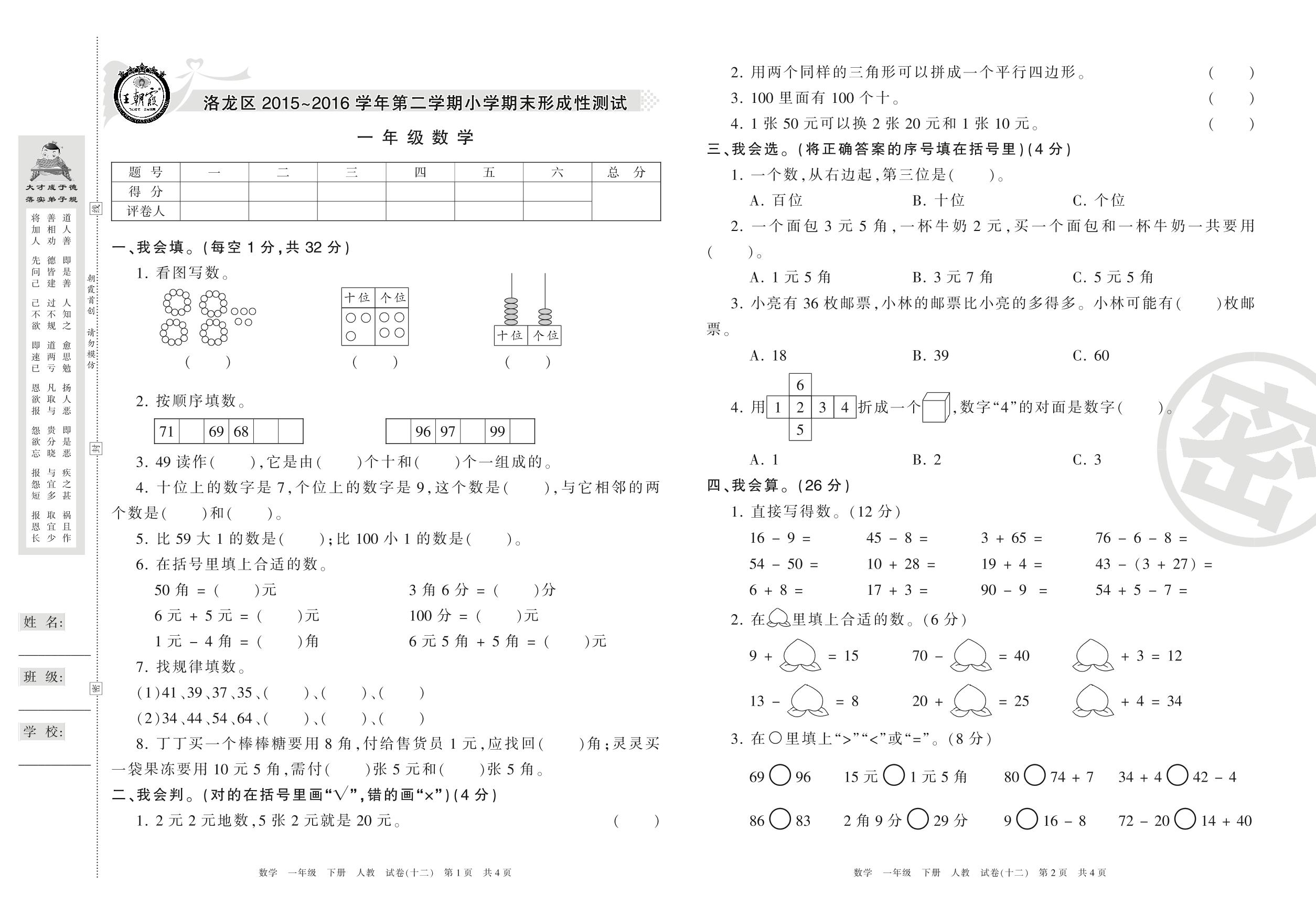 2015-2016学年第二学期洛阳市洛龙区一年级数学试卷(人教版)【12】