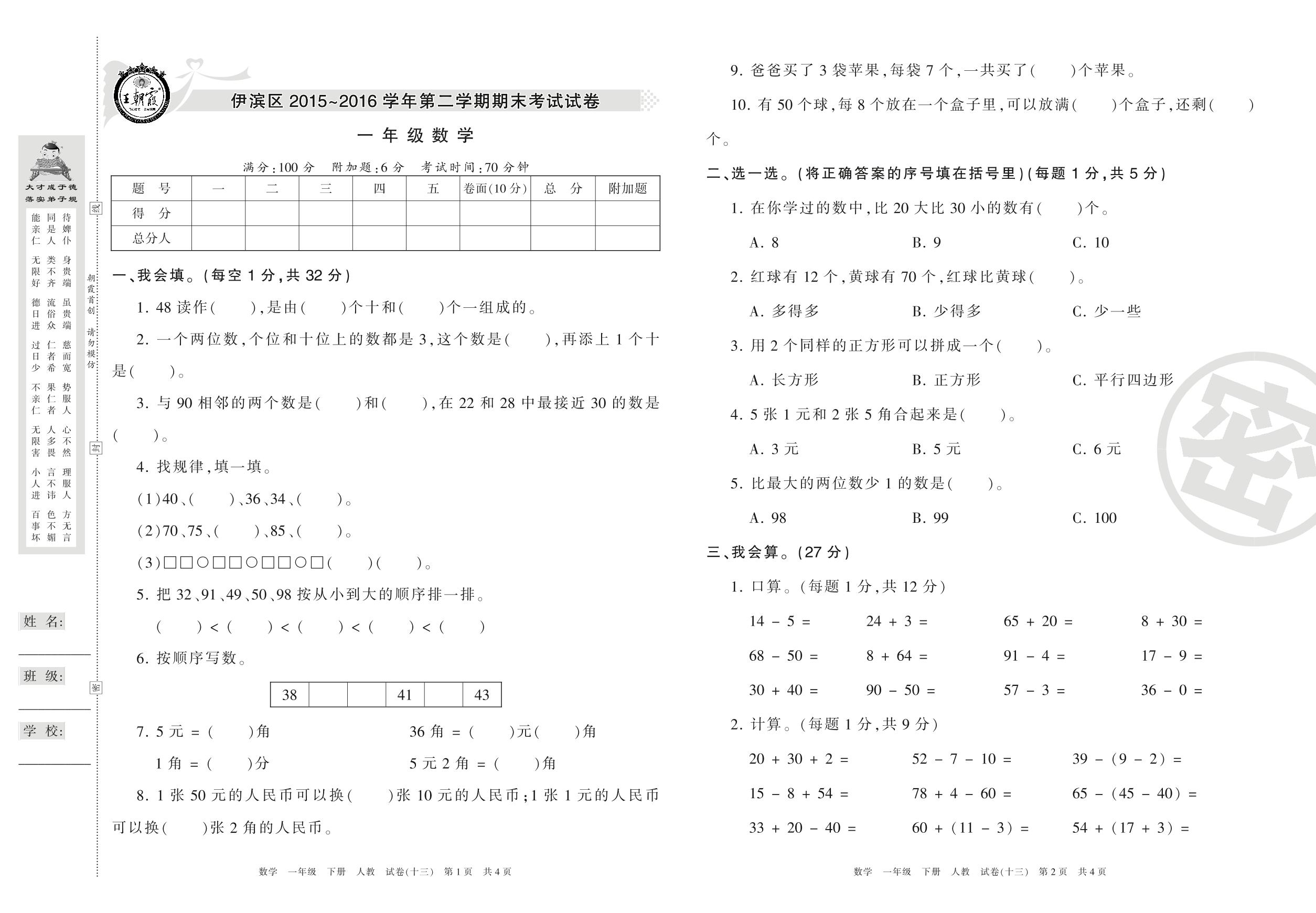 2015-2016学年第二学期洛阳市伊滨区一年级数学试卷(人教版)【13】