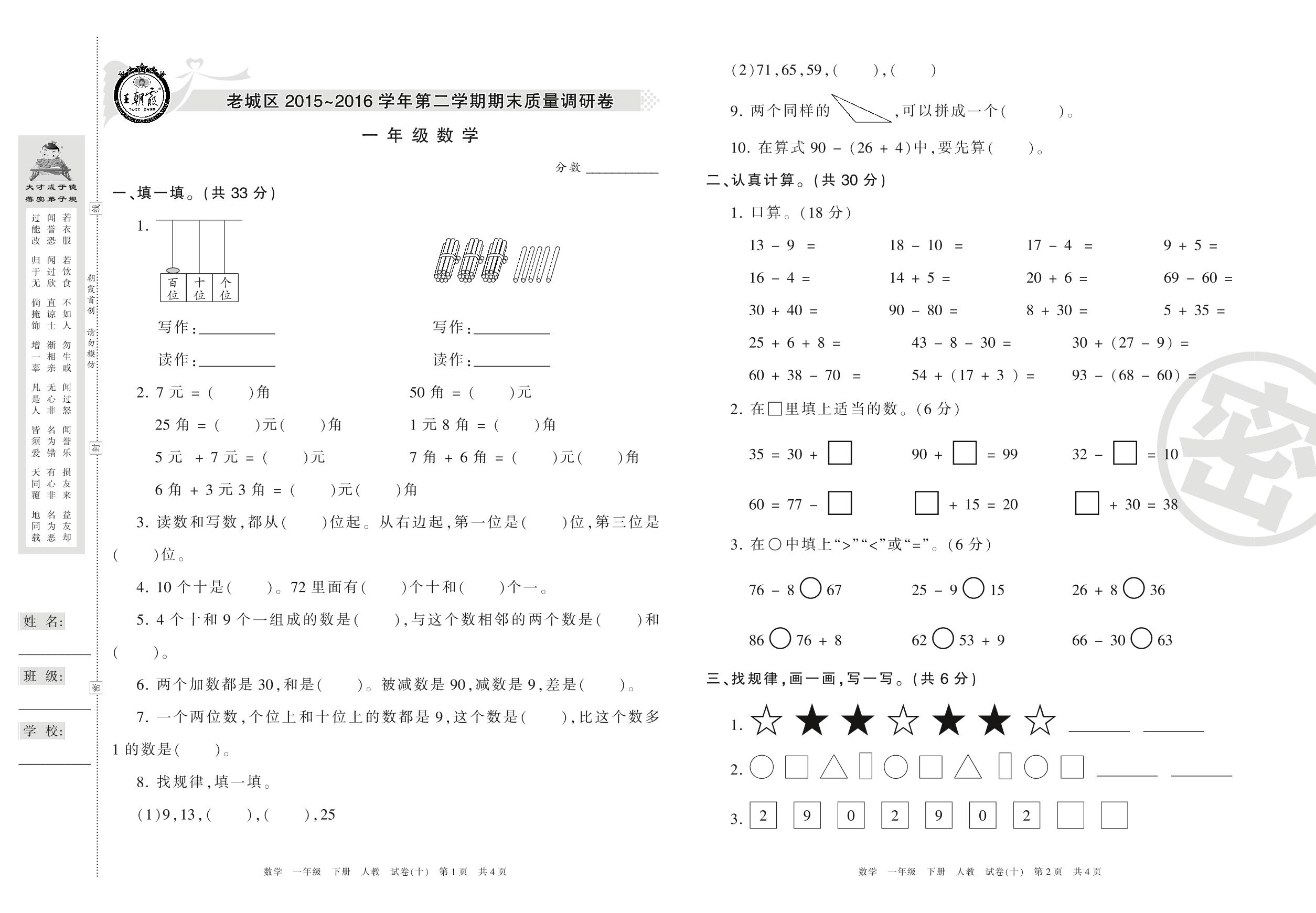 2015-2016学年第二学期洛阳市老城区一年级数学试卷(人教版)【10】