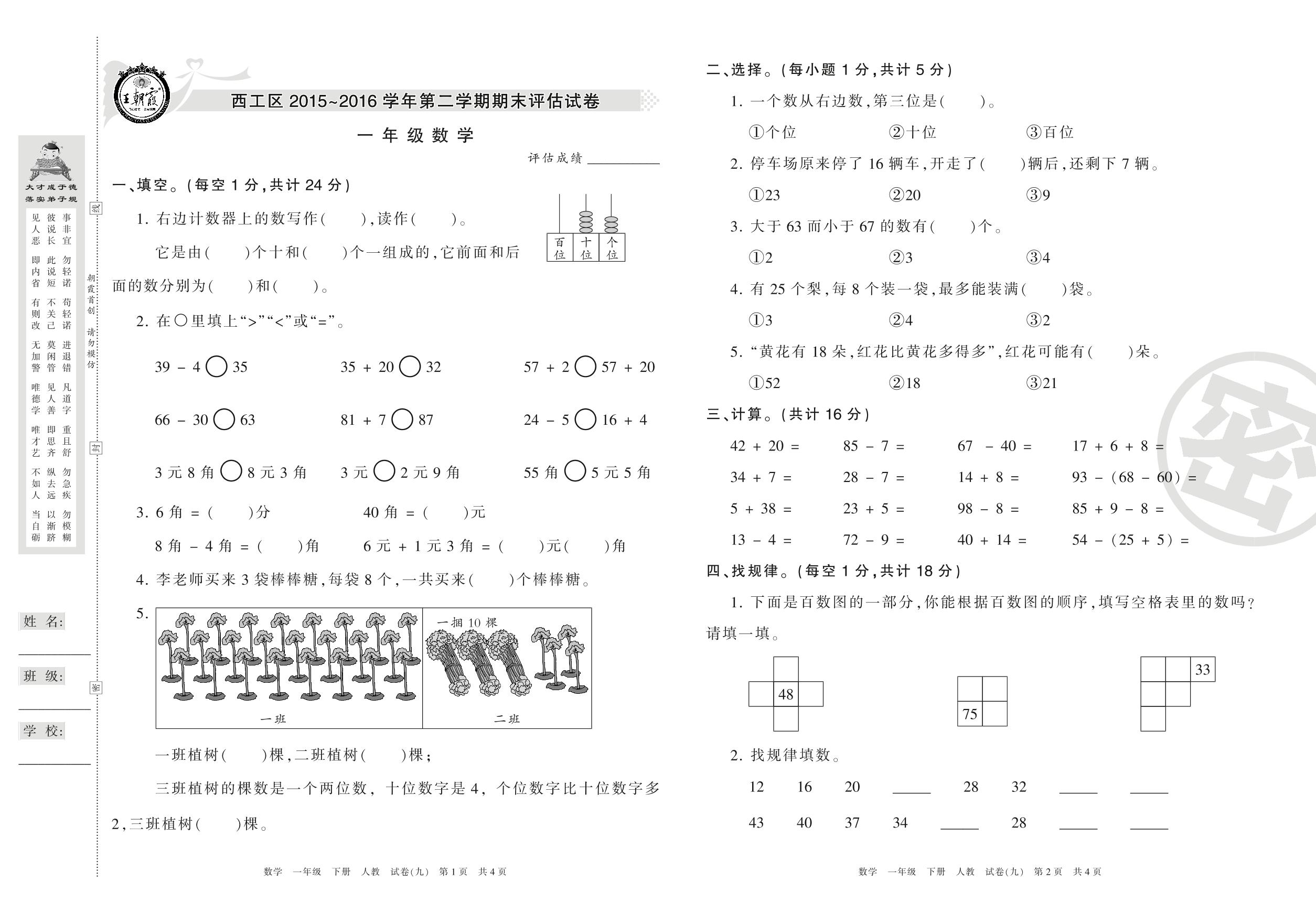 2015-2016学年第二学期洛阳市西工区一年级数学试卷(人教版)【9】