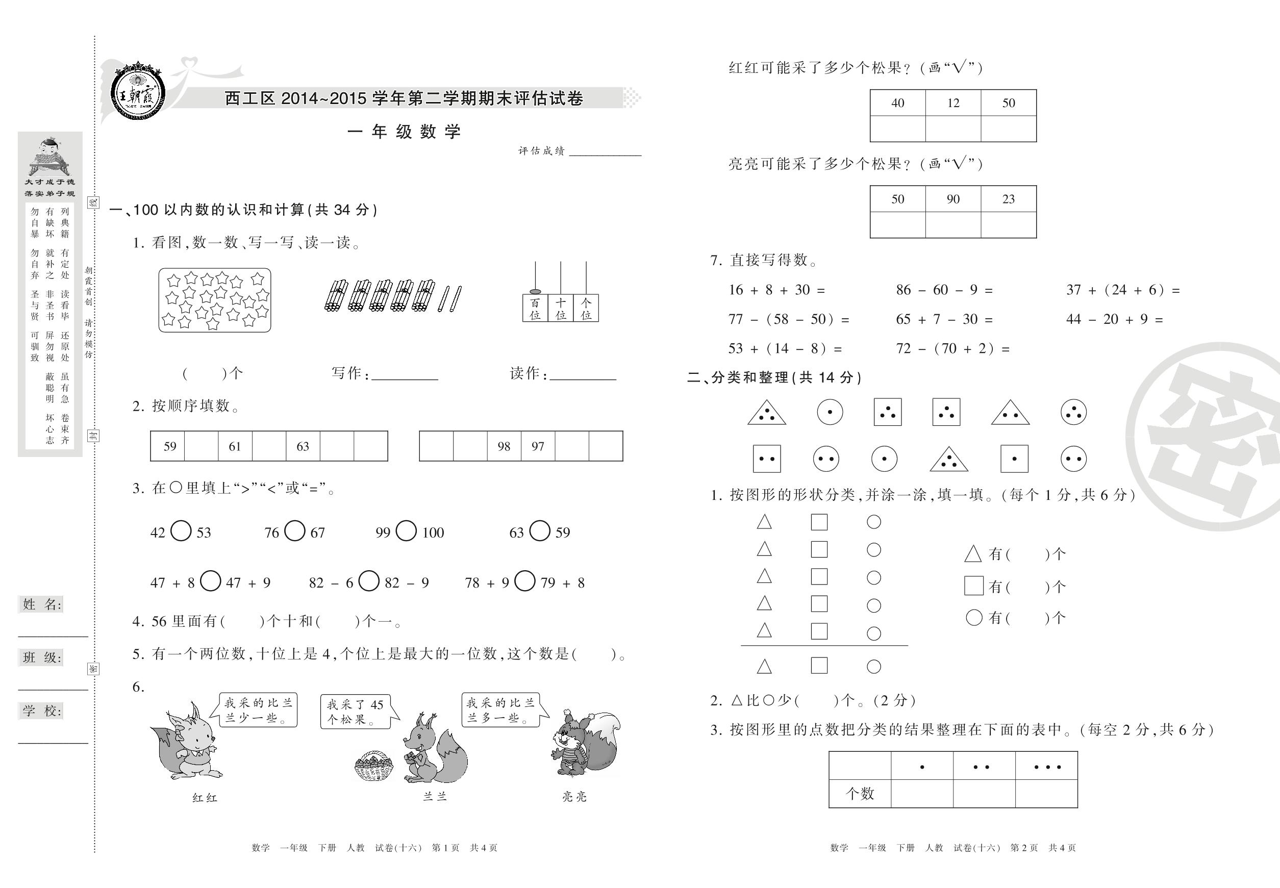 2014-2015学年第二学期洛阳市西工区一年级数学试卷(人教版)【16】