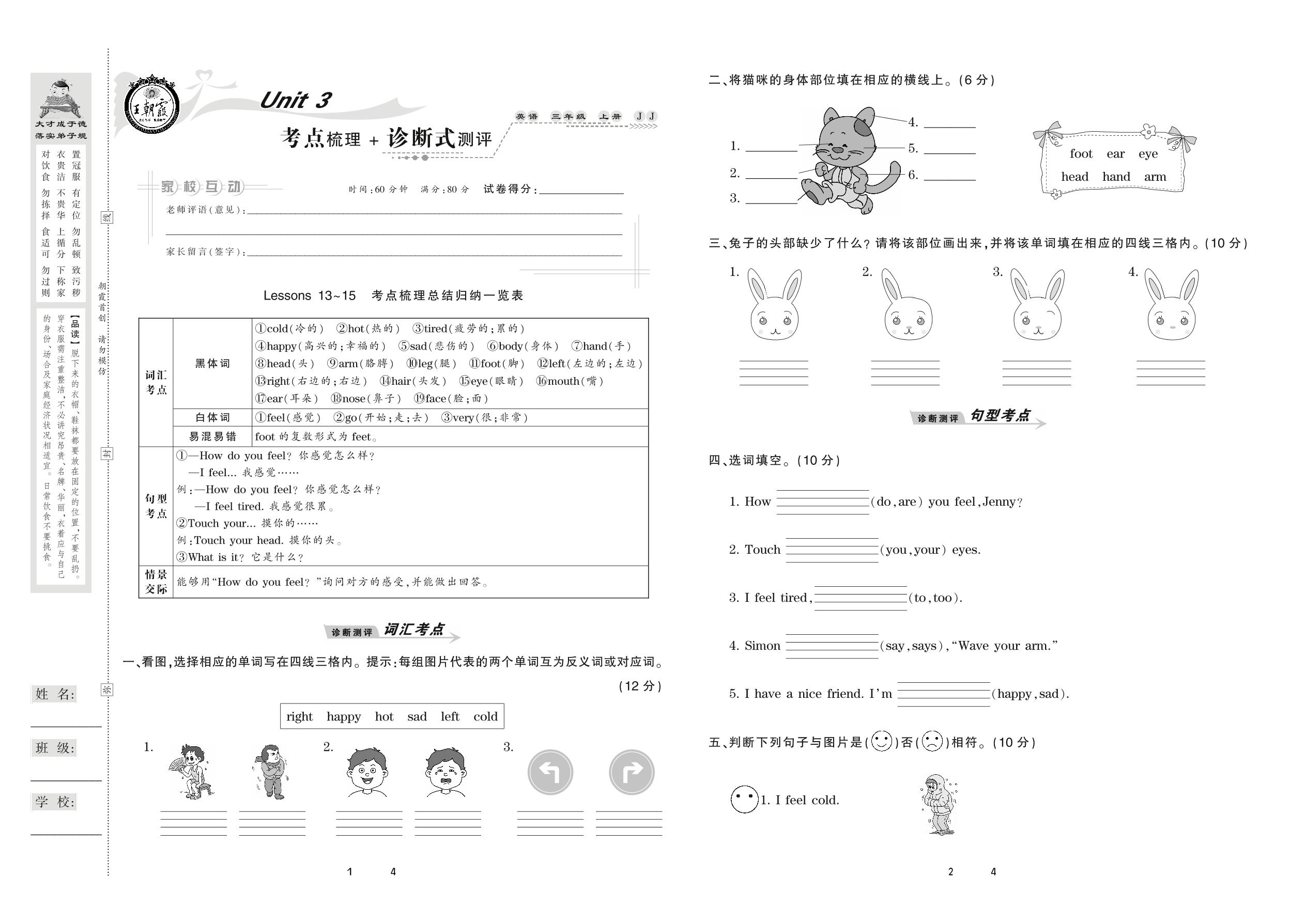 2020上册三年级英语冀教版 Unit 3 考点梳理+诊断式测评 Lessons 13-15