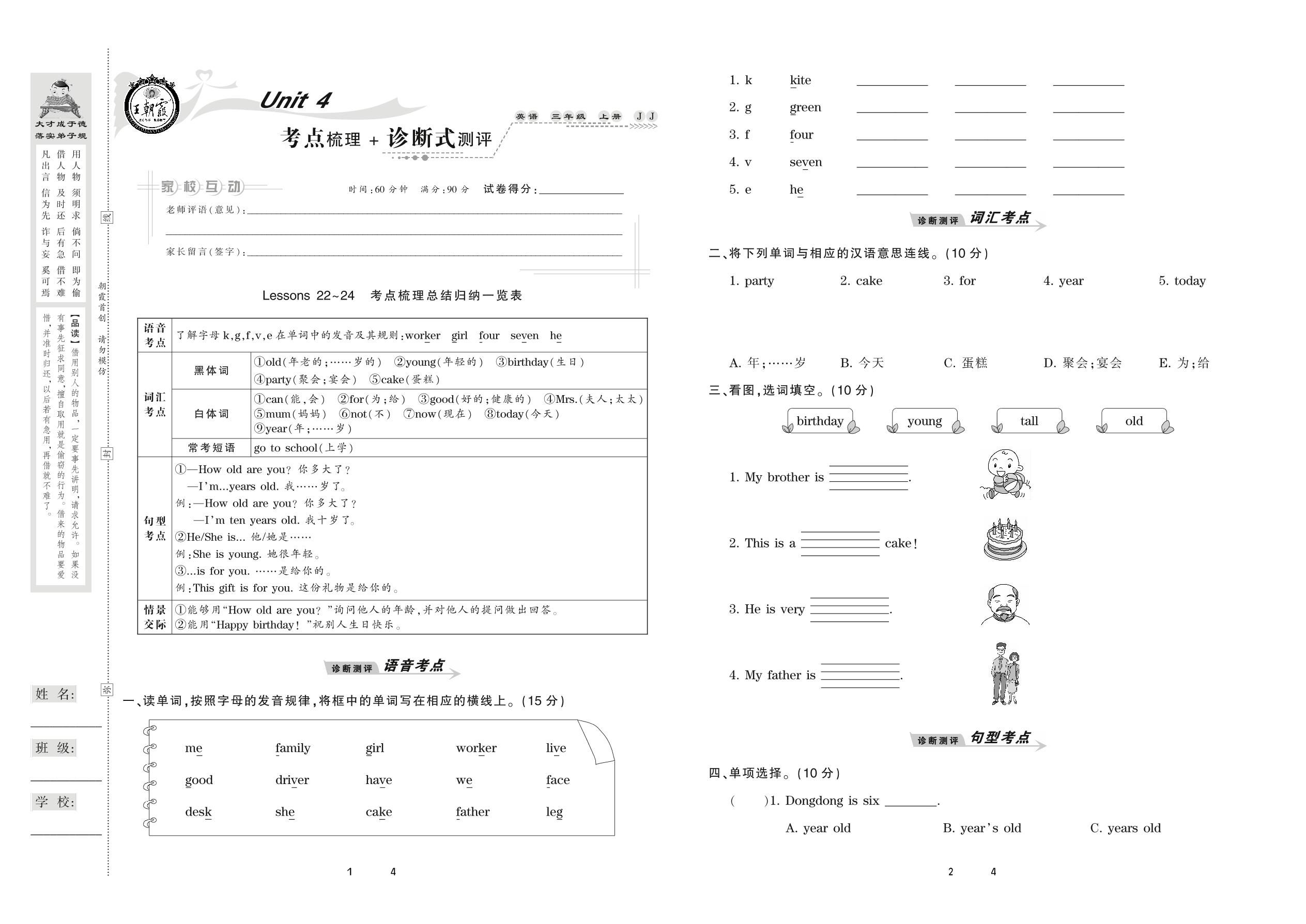 2020上册三年级英语冀教版 Unit 4 考点梳理+诊断式测评 Lessons 22-24