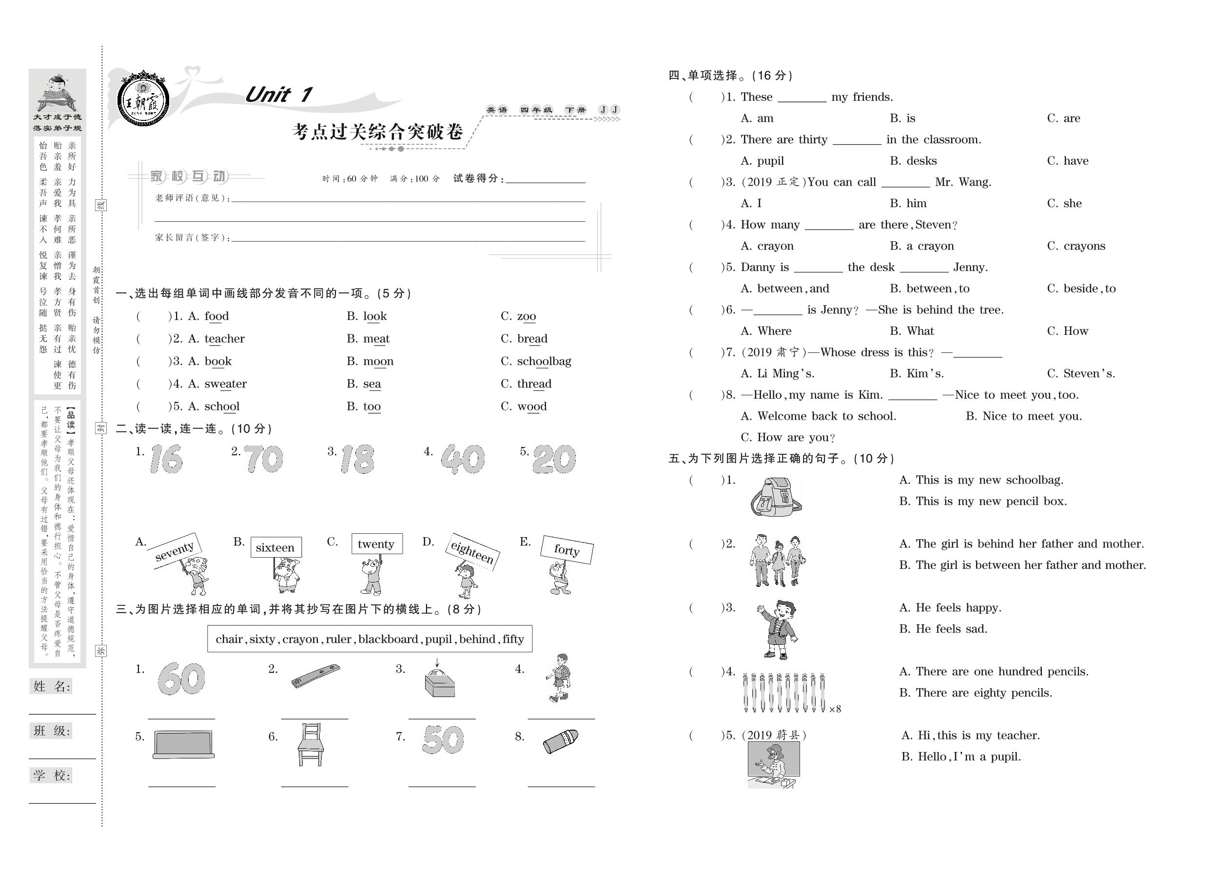 2021下册四年级英语冀教版 Unit 1 考点过关综合突破卷