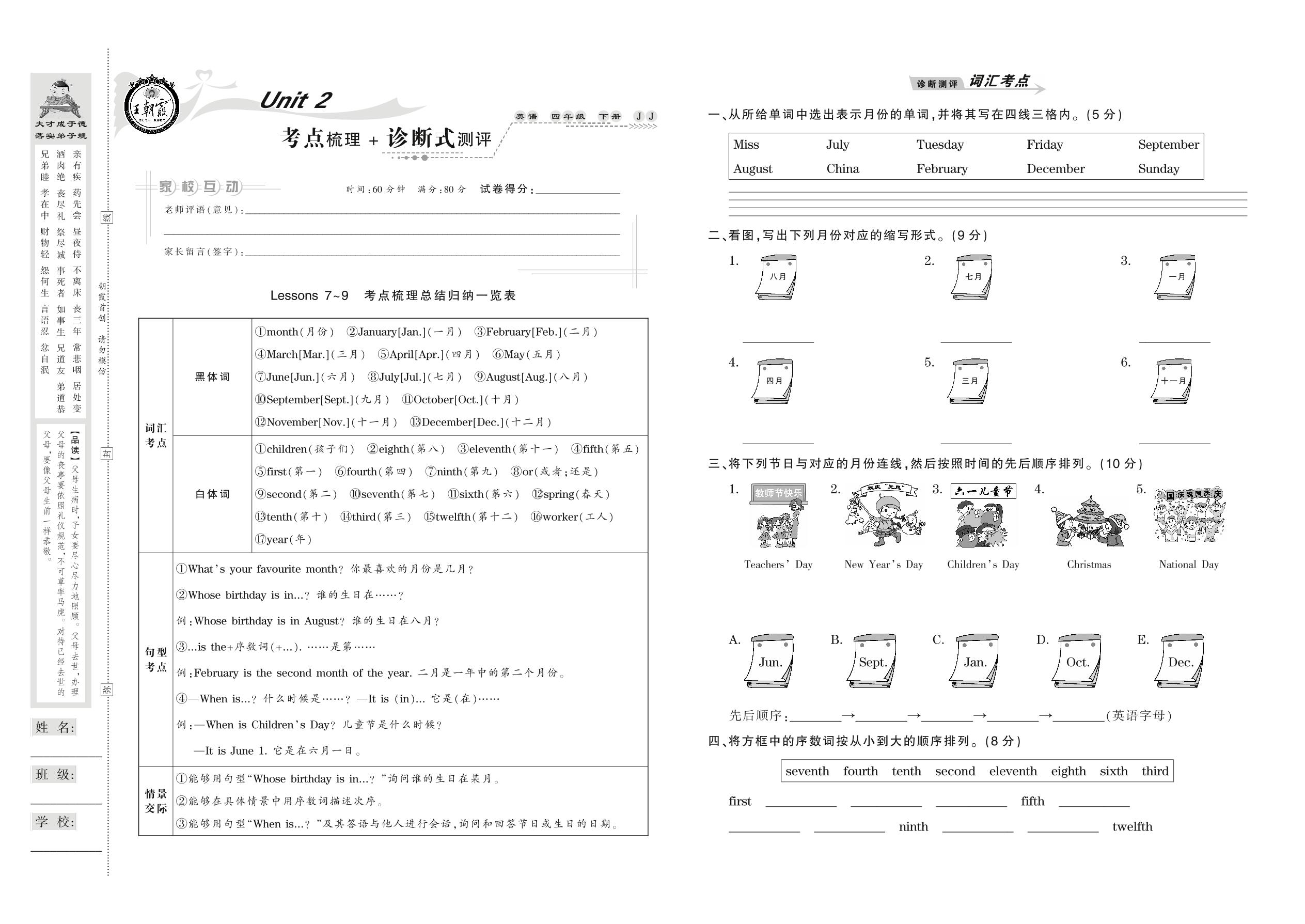 2021下册四年级英语冀教版 Unit 2 考点梳理+诊断式测评 Lessons 7-9