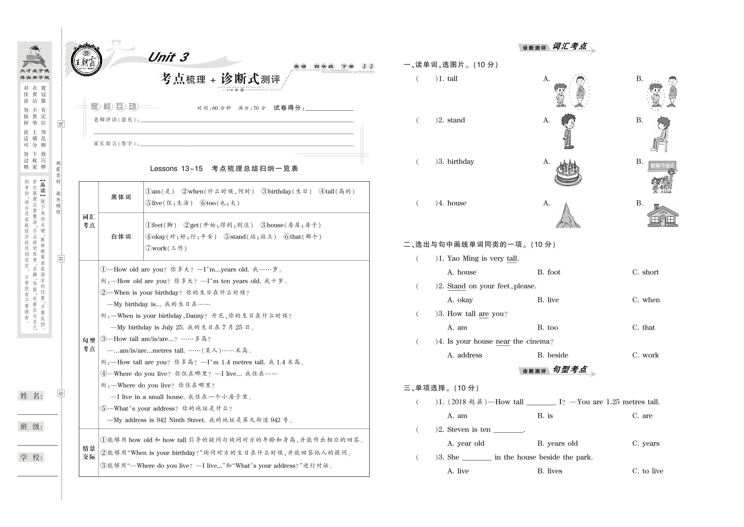 2021下册四年级英语冀教版 Unit 3 考点梳理+诊断式测评 Lessons 13-15