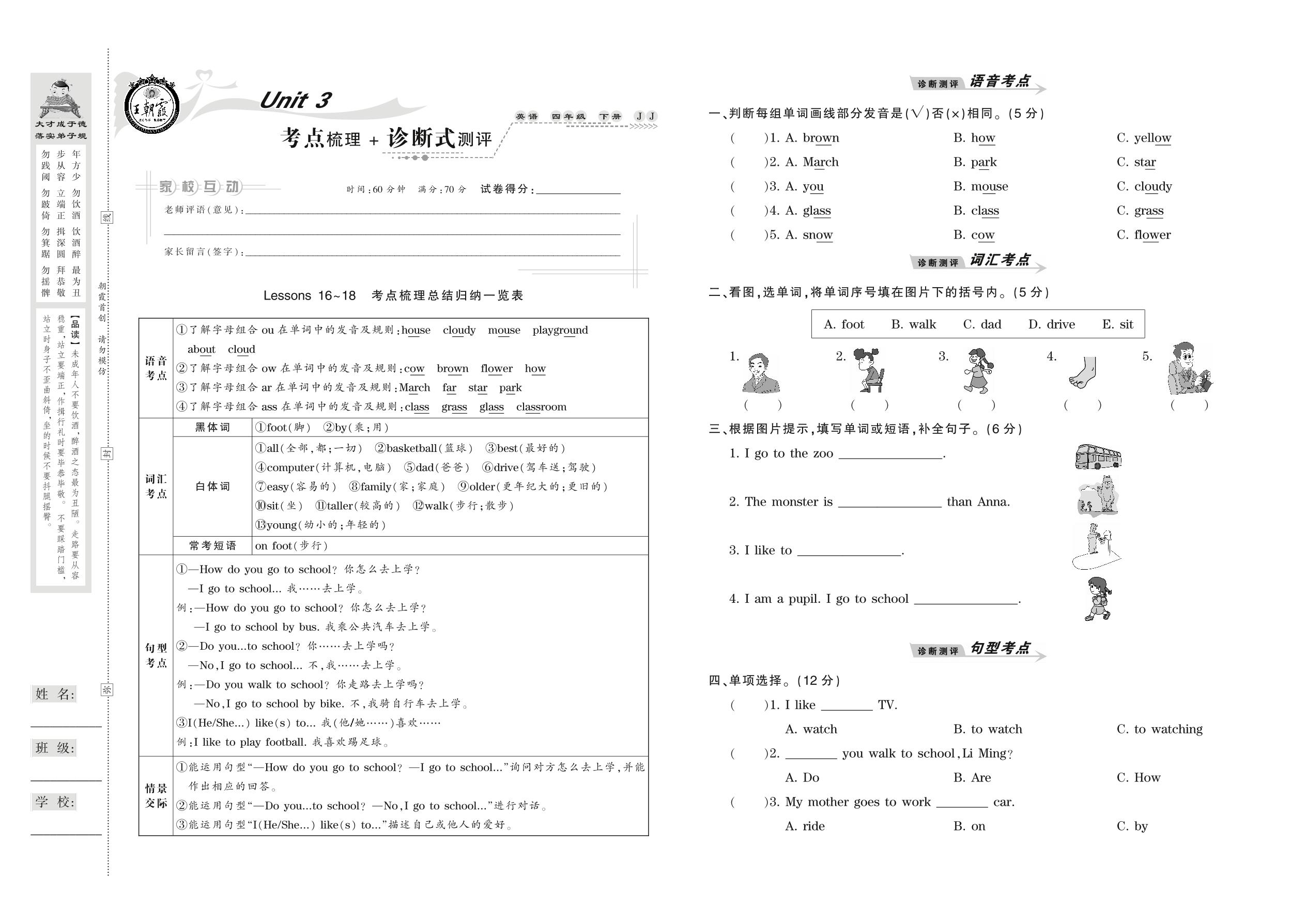 2021下册四年级英语冀教版 Unit 3 考点梳理+诊断式测评 Lessons 16-18