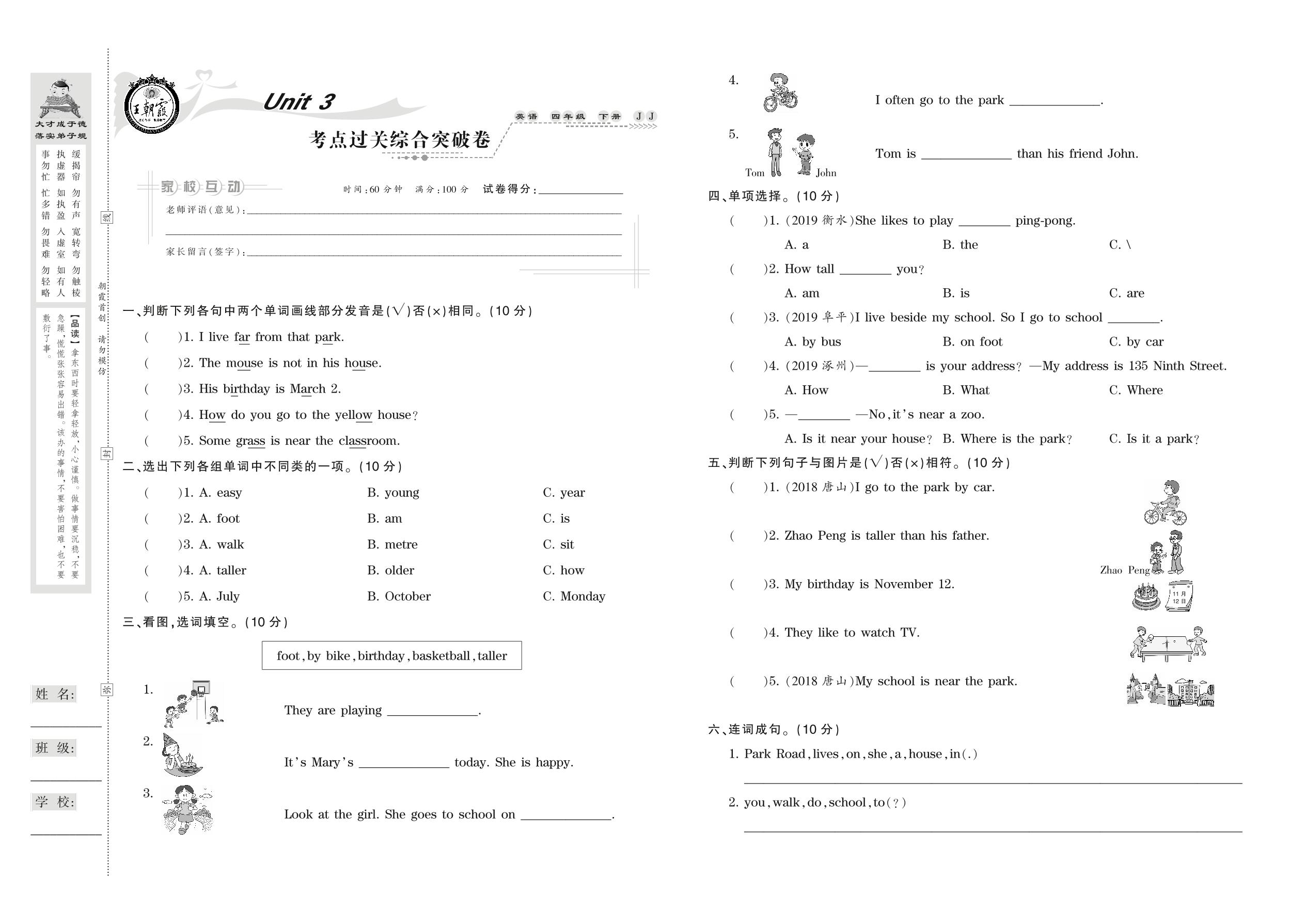 2021下册四年级英语冀教版 Unit 3 考点过关综合突破卷