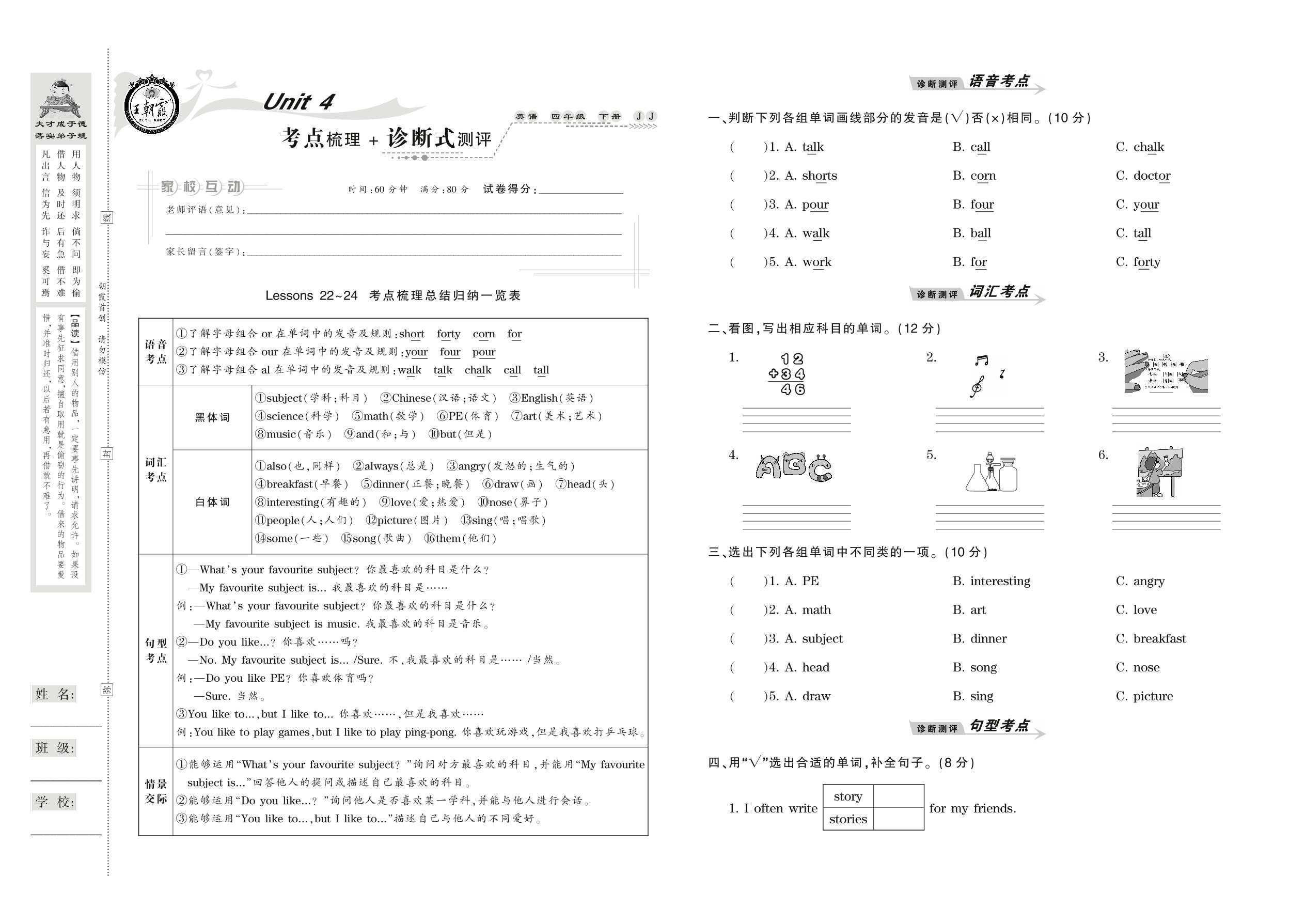 2021下册四年级英语冀教版 Unit 4 考点梳理+诊断式测评 Lessons 22-24