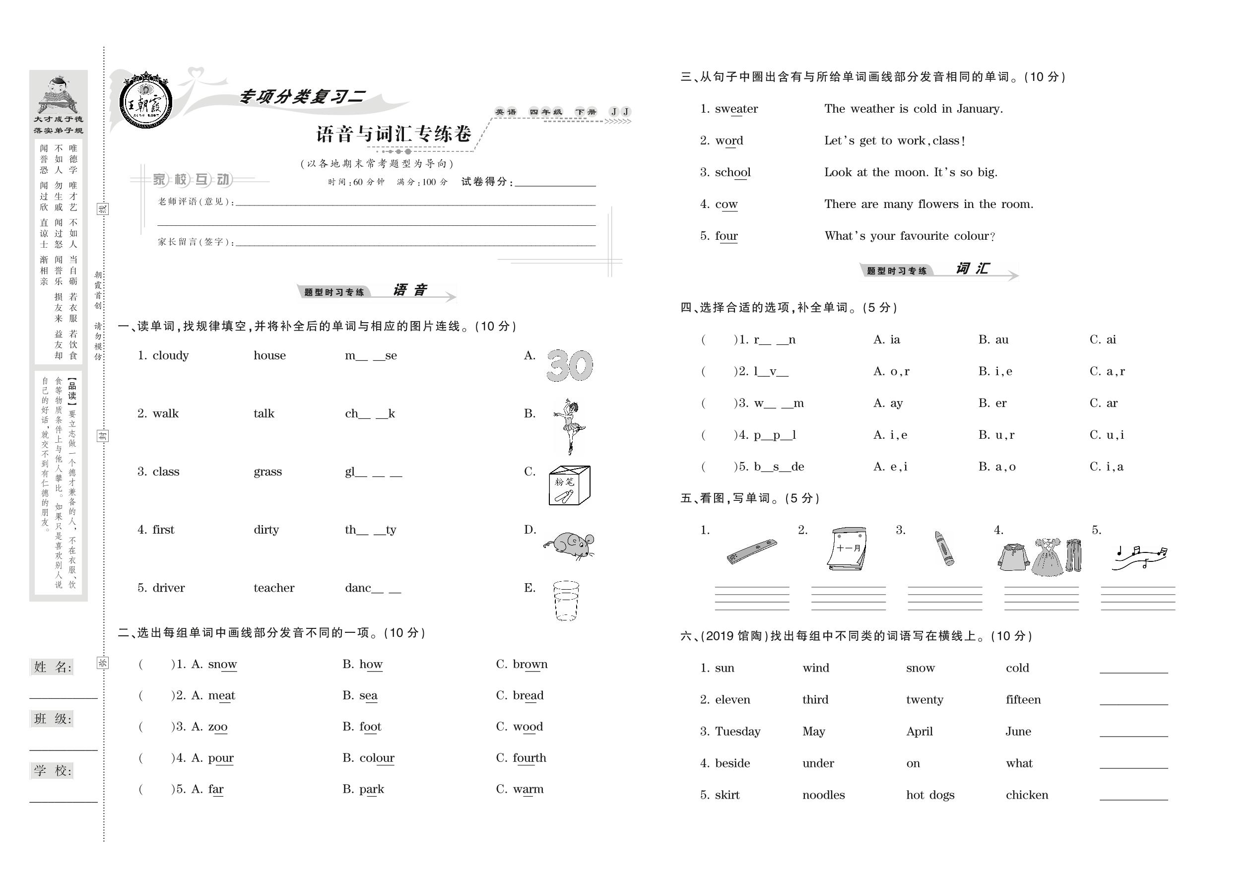 2021下册四年级英语冀教版 语音与词汇专练卷