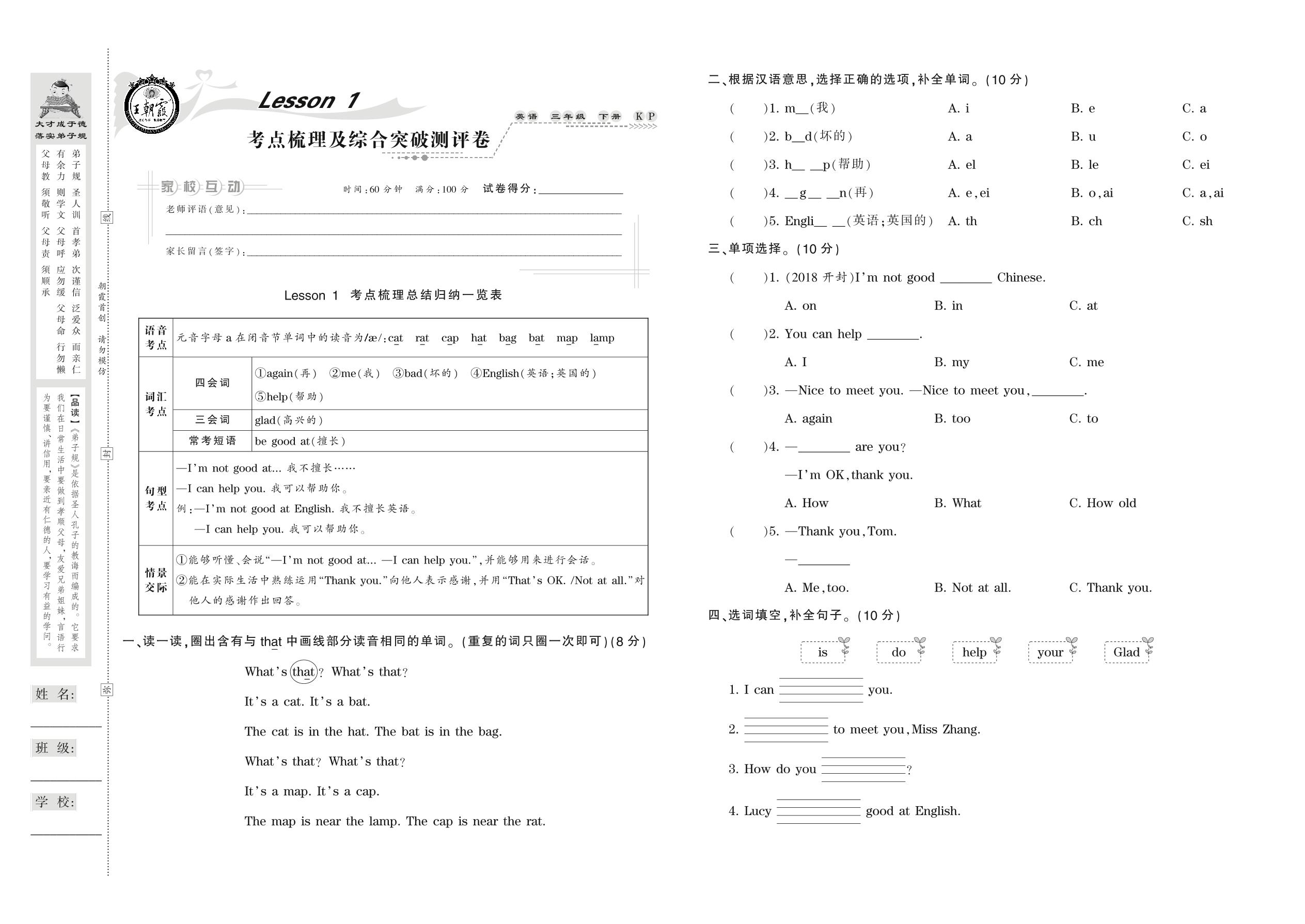 2021下册三年级英语科普版 Lesson 1 考点梳理及综合突破测评卷