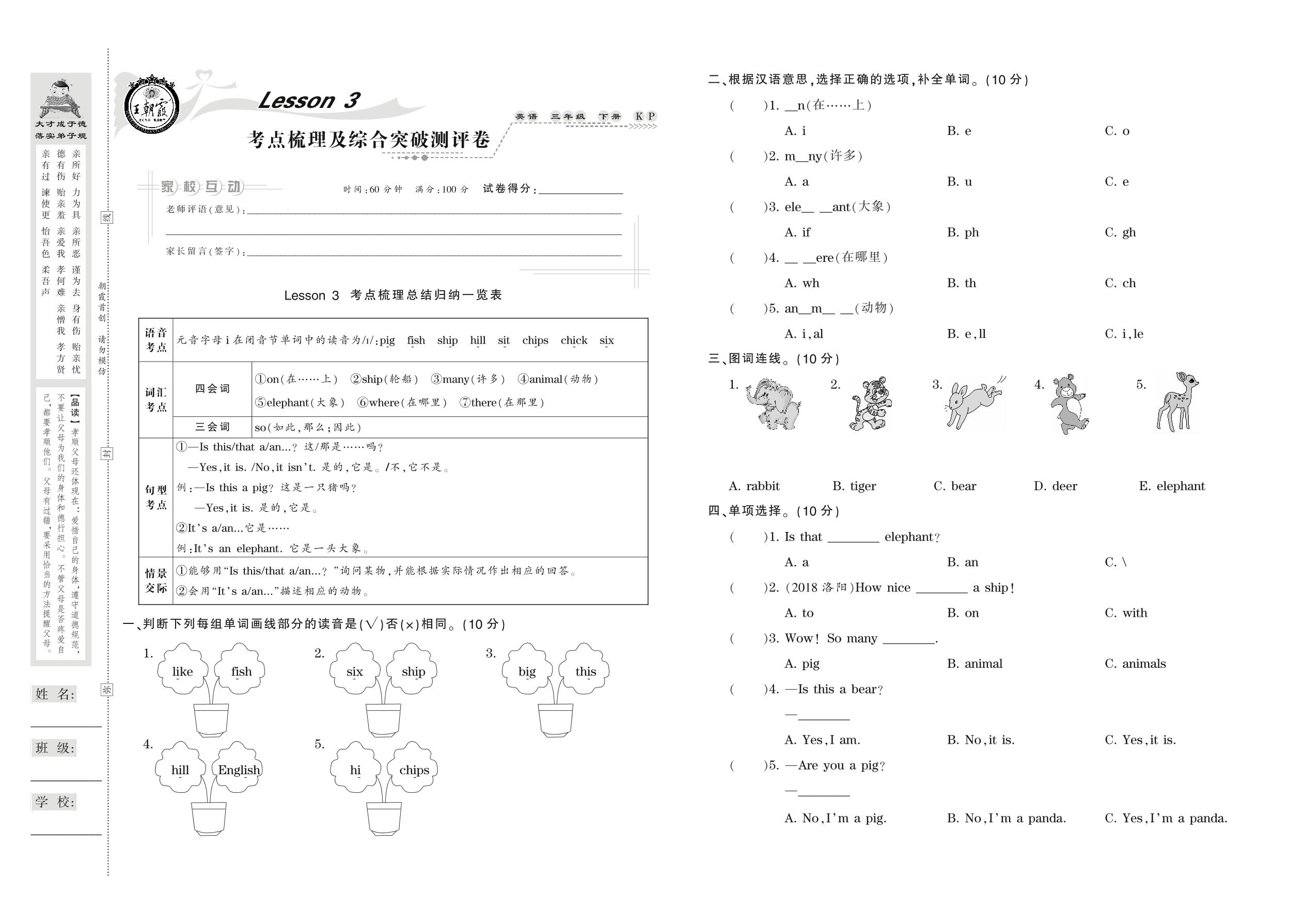 2021下册三年级英语科普版 Lesson 3 考点梳理及综合突破测评卷