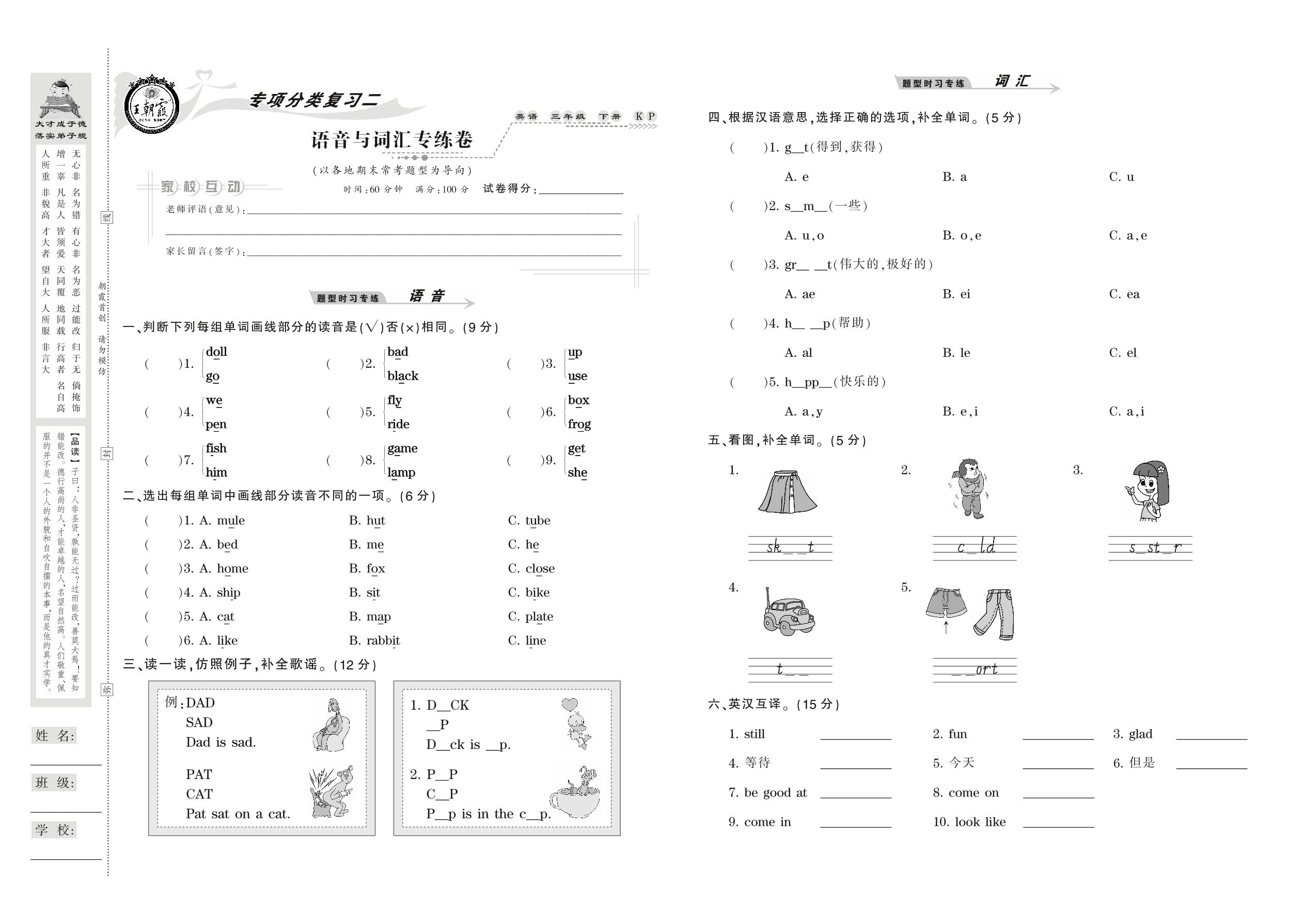 2021下册三年级英语科普版 语音与词汇专练卷
