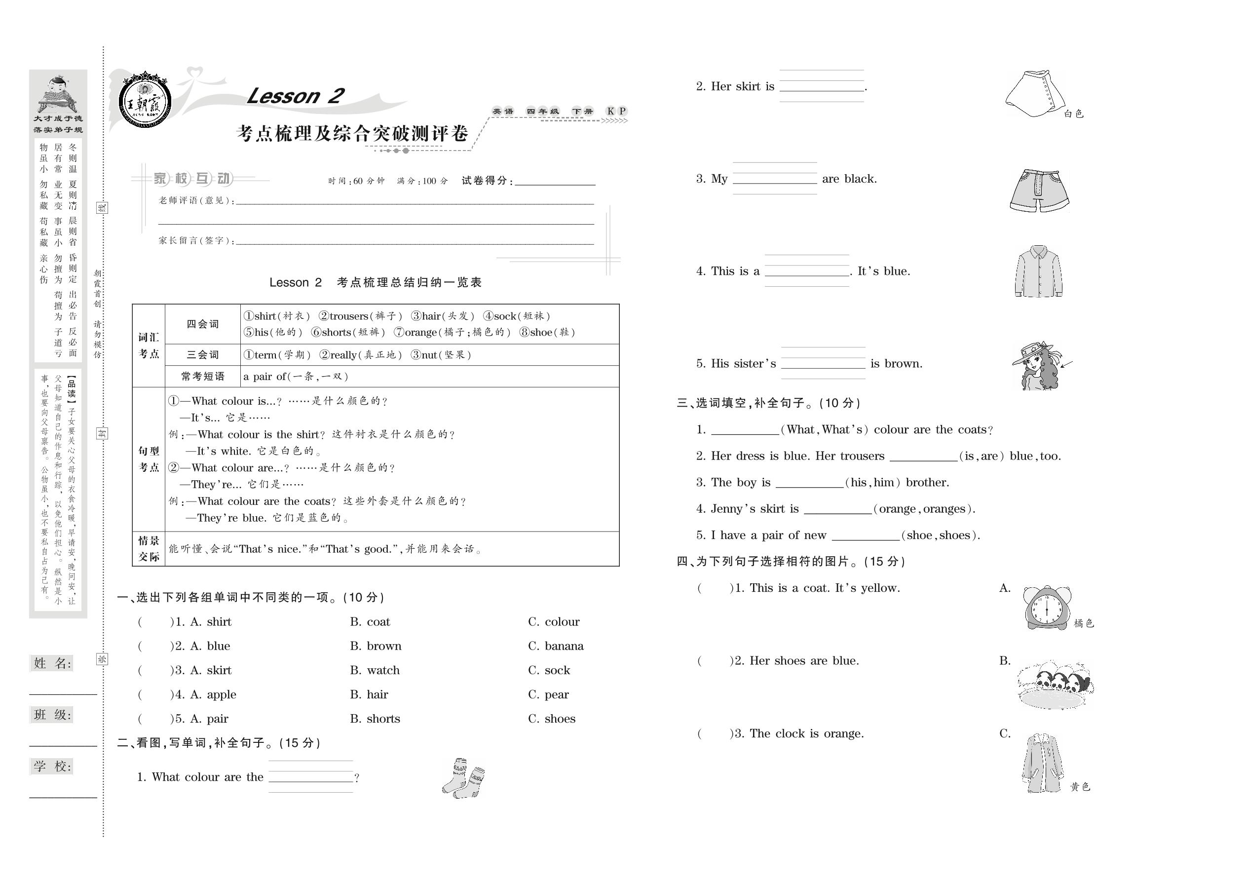 2021下册四年级英语科普版 Lesson 2 考点梳理及综合突破测评卷