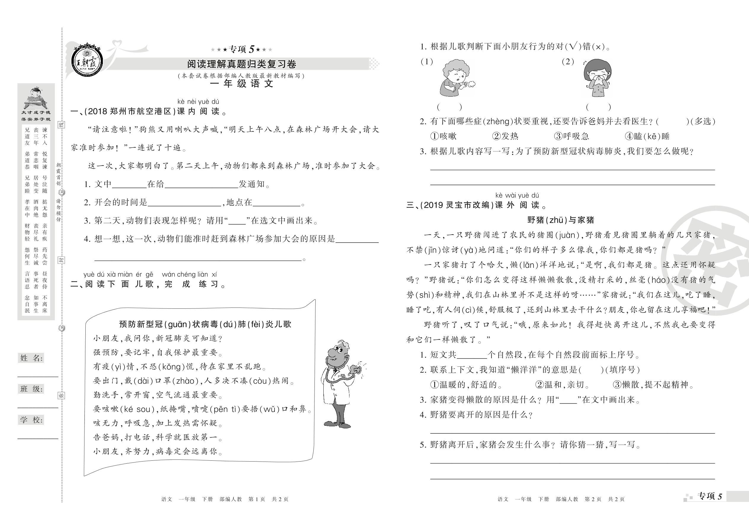 王朝霞期末专项卷——阅读理解、写话真题归类复习卷一年级下册语文(人教版)_R210731180421【0】