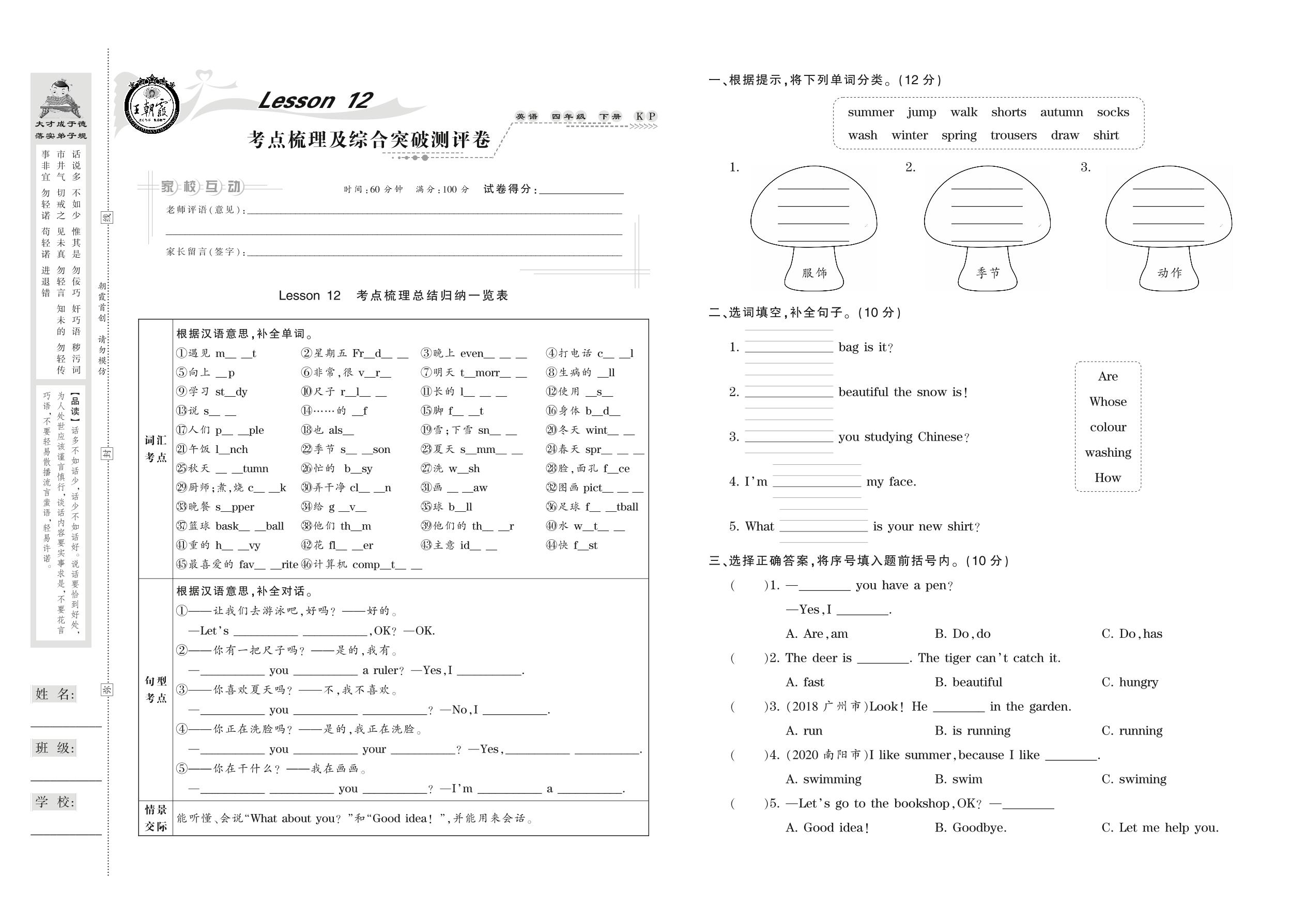 2021下册四年级英语科普版 Lesson 12 考点梳理及综合突破测评卷