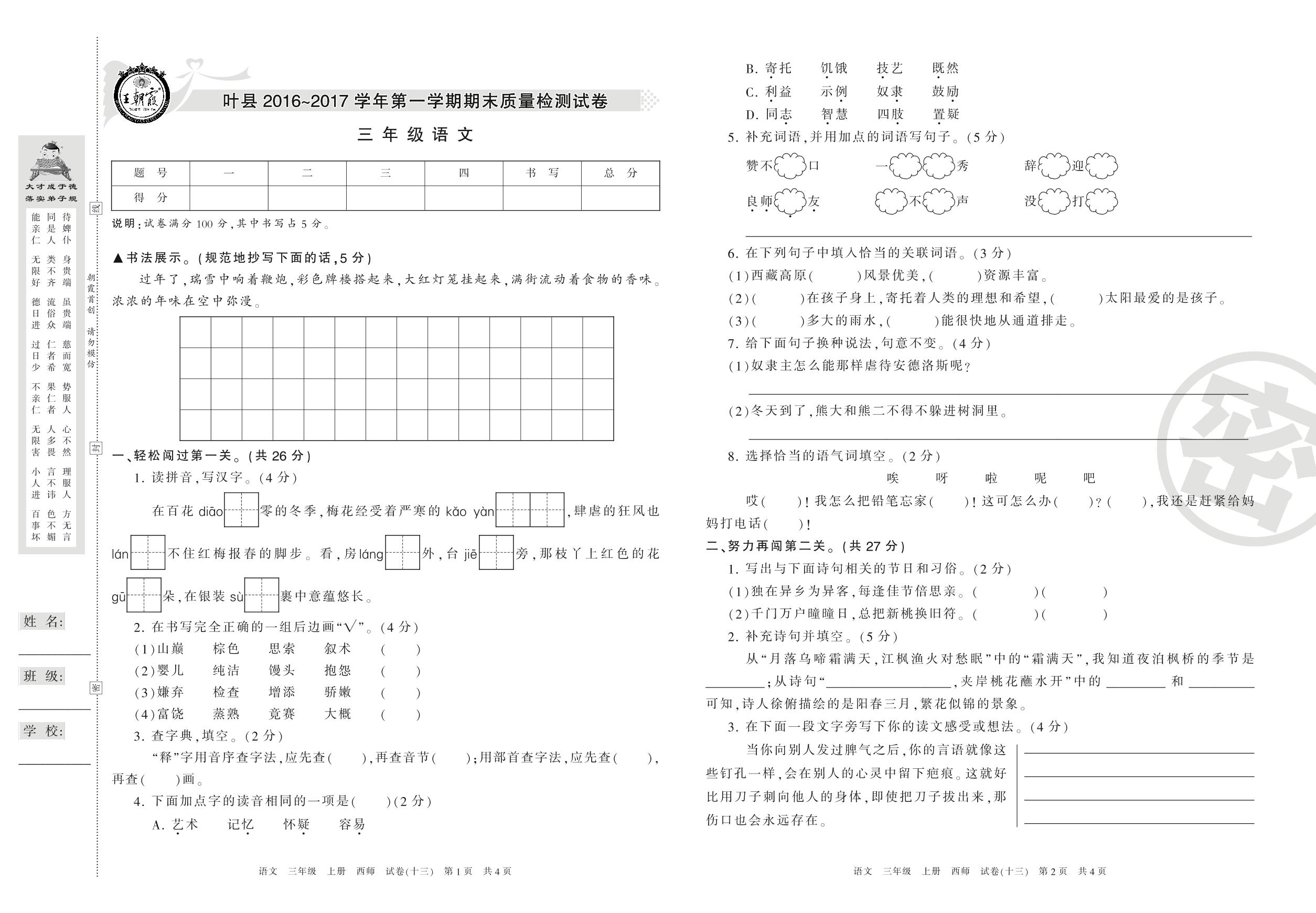 2016-2017学年第一学期平顶山市叶县三年级语文试卷(西师版)【13】