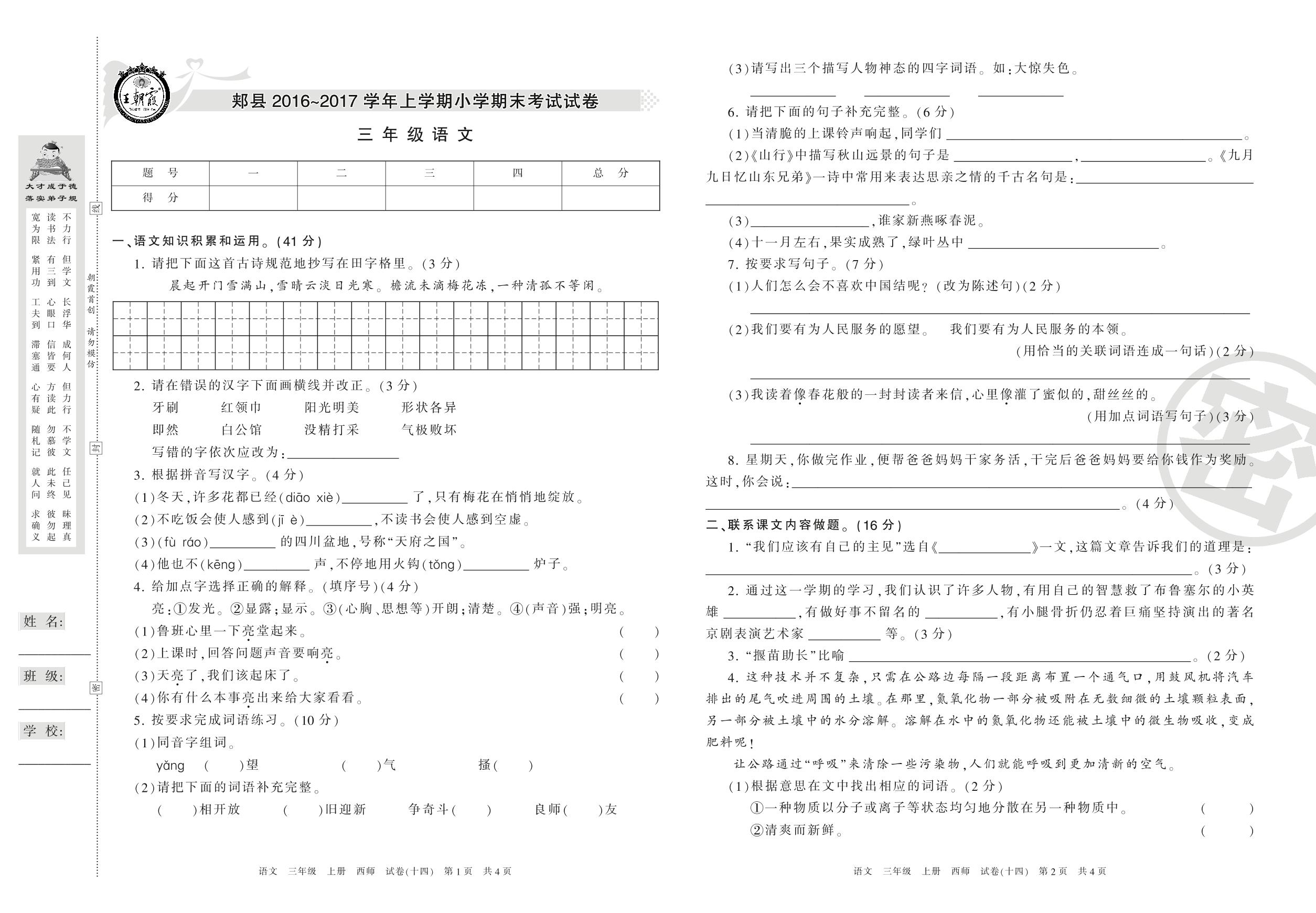 2016-2017学年第一学期平顶山市郏县三年级语文试卷(西师版)【14】