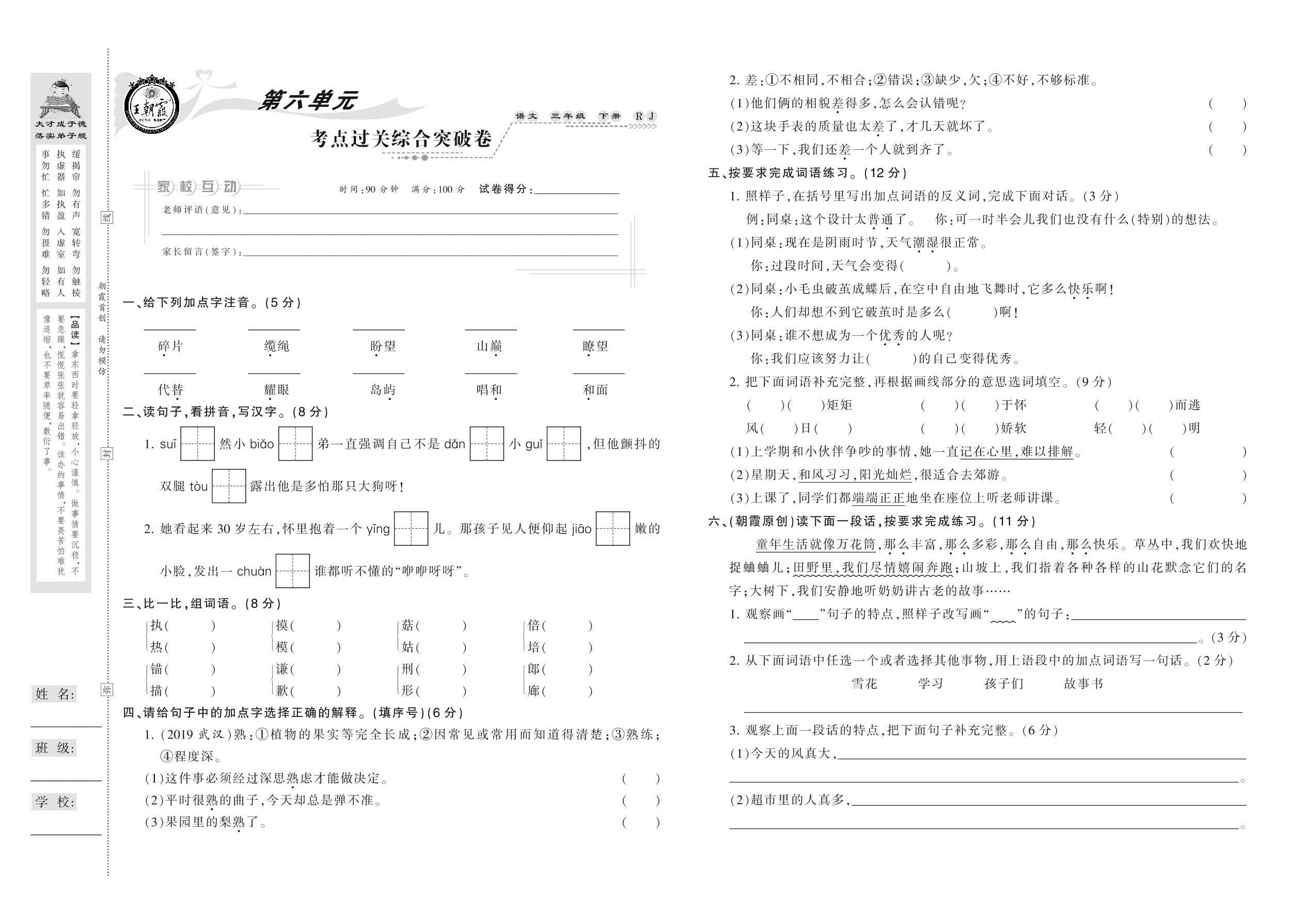 2021下册三年级语文人教版 第六单元 考点过关综合突破卷