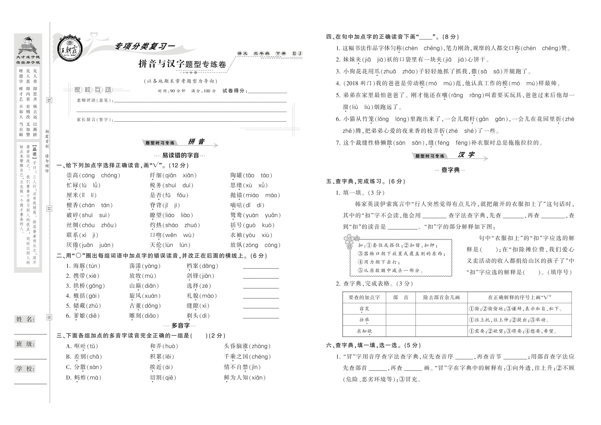 2021下册三年级语文人教版 拼音与汉字题型专练卷