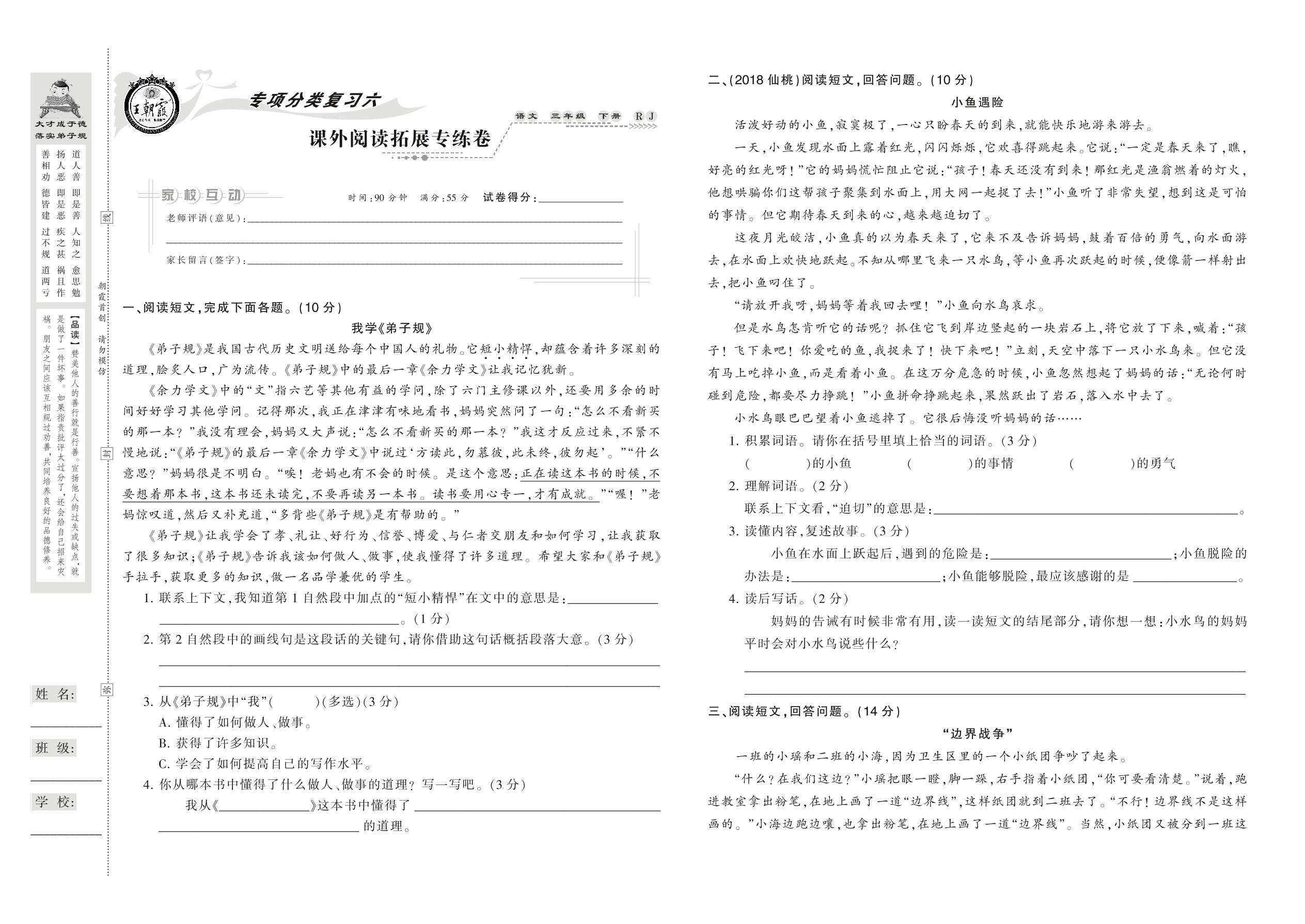 2021下册三年级语文人教版 课外阅读拓展专练卷