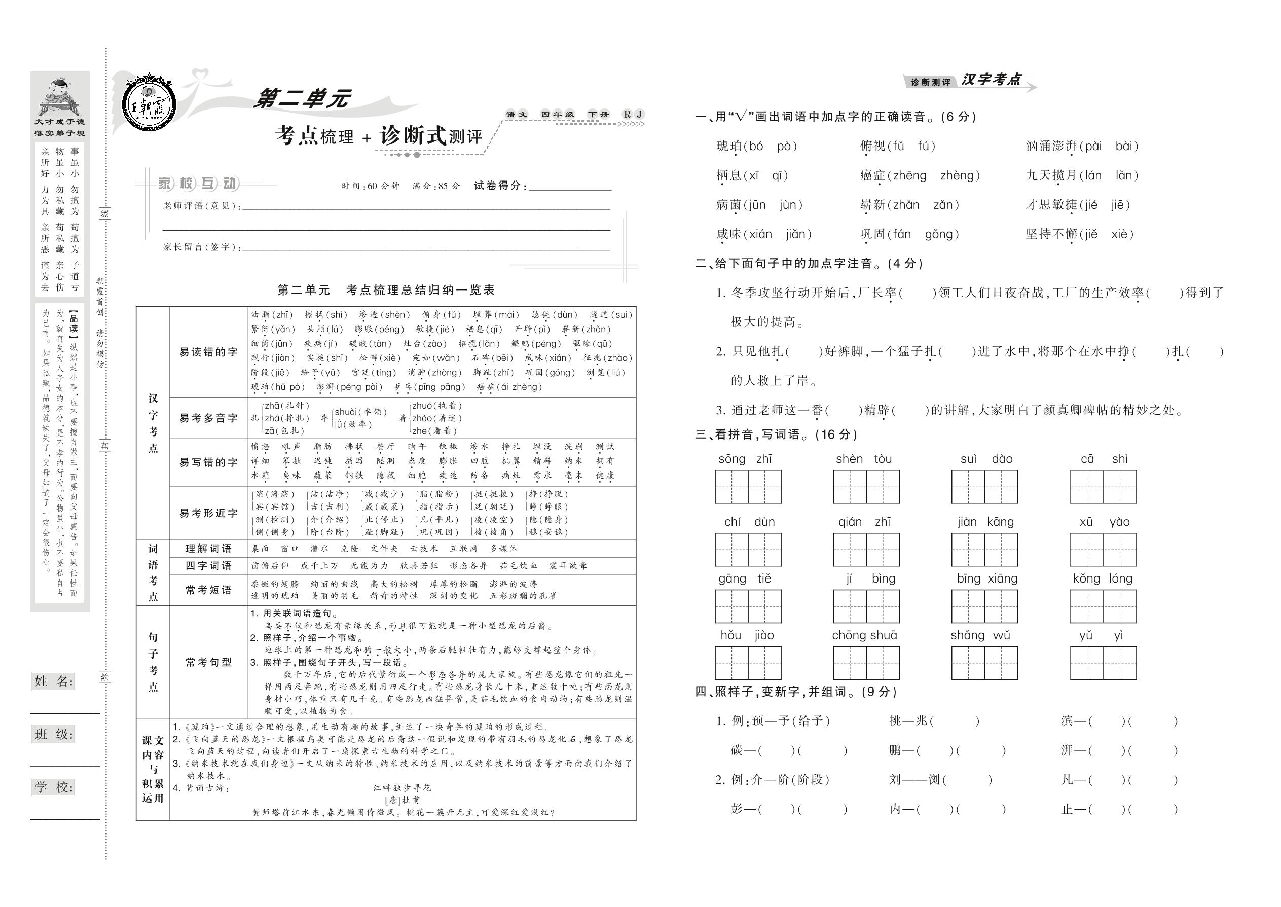 2021下册四年级语文人教版 第二单元 考点梳理 + 诊断式测评