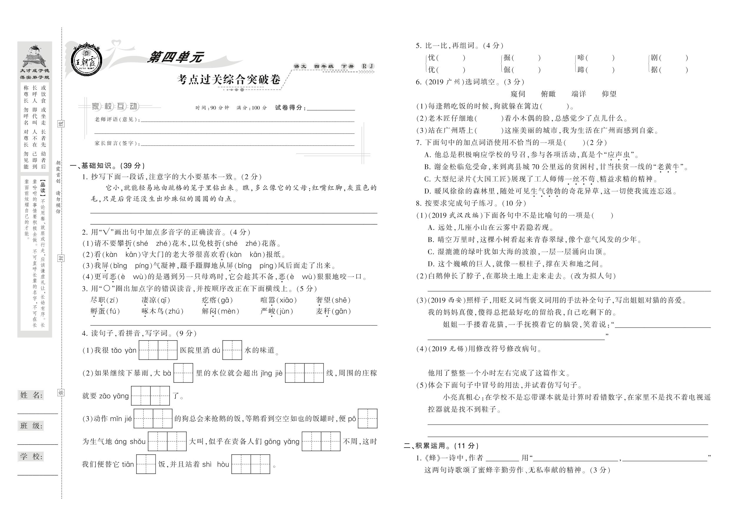 2021下册四年级语文人教版 第四单元 考点过关综合突破卷