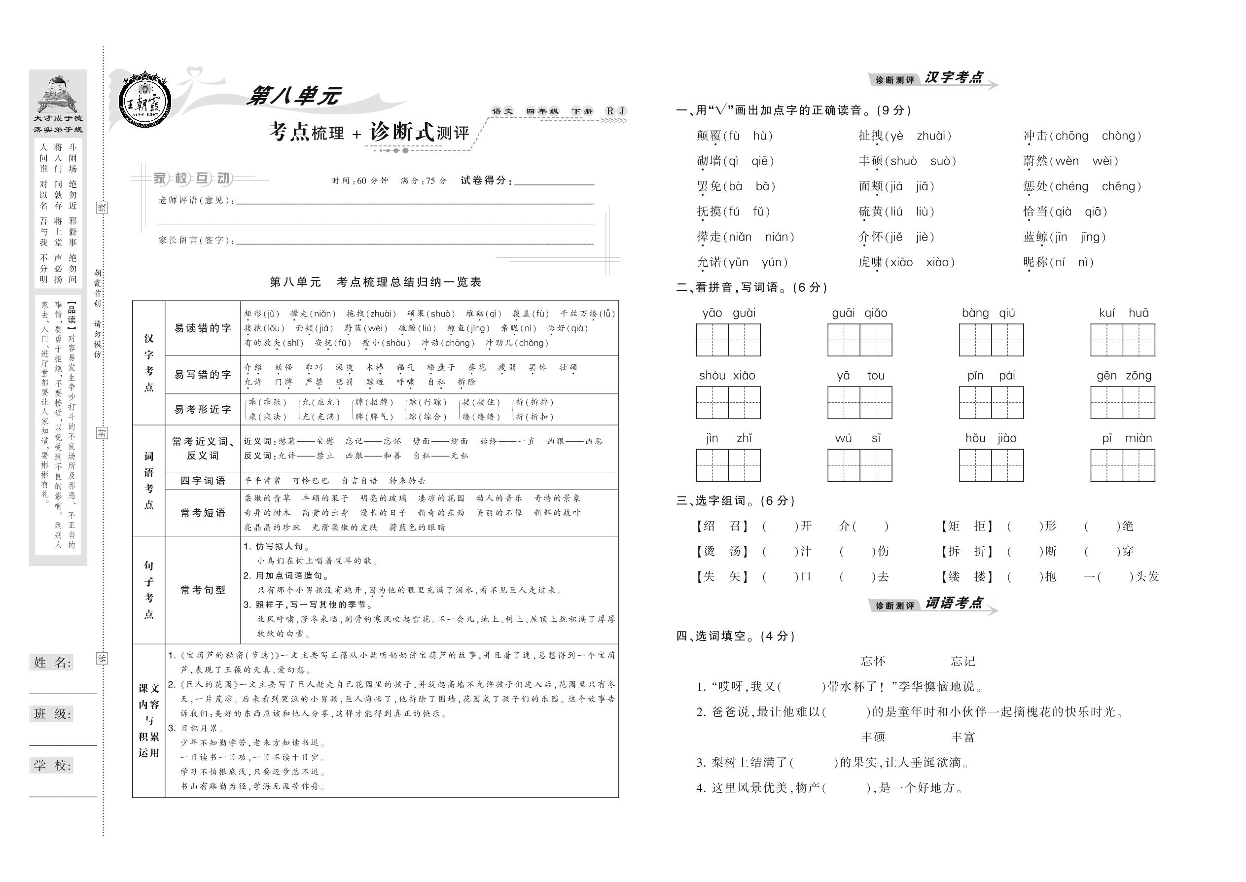 2021下册四年级语文人教版 第八单元 考点梳理 + 诊断式测评