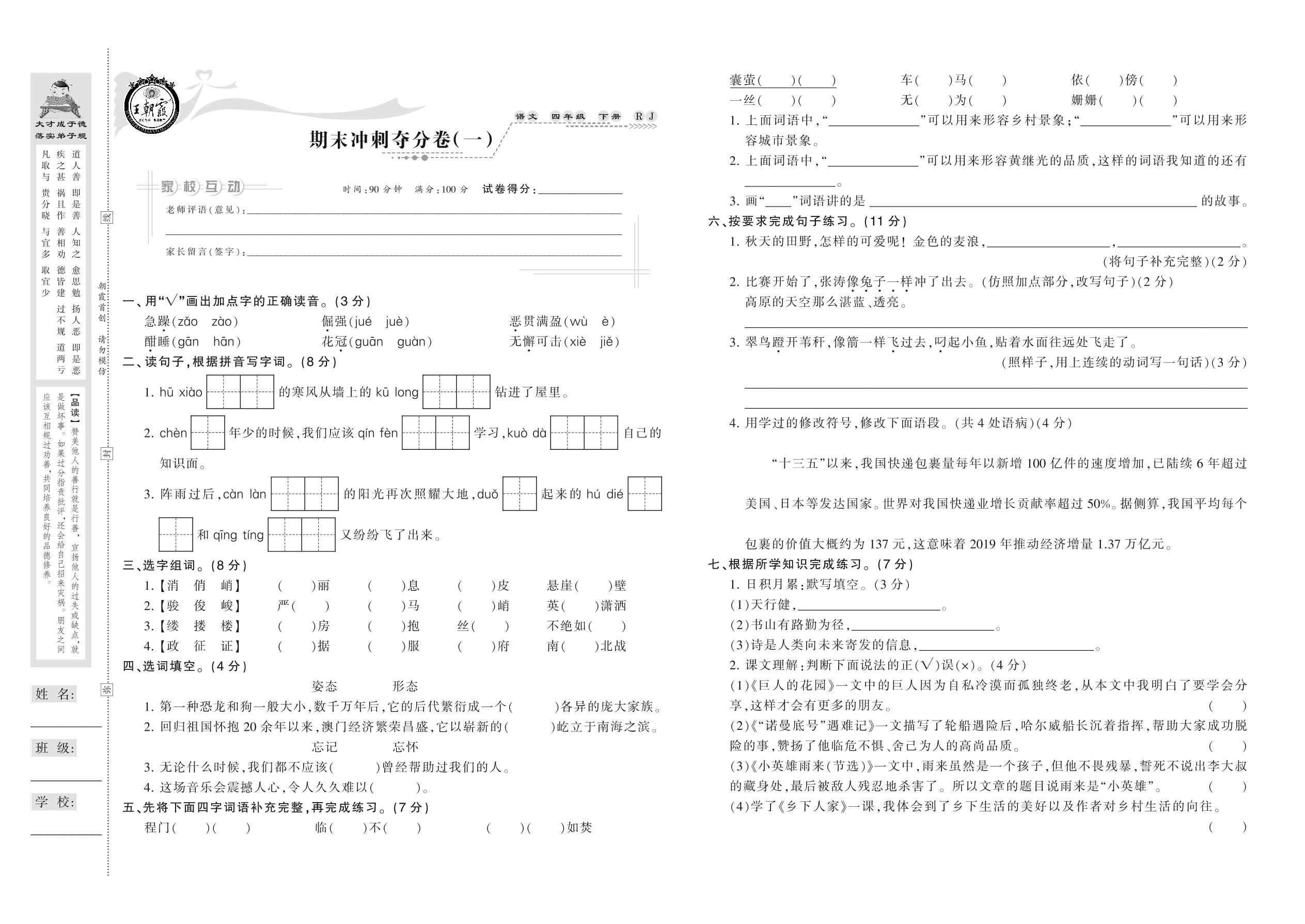 2021下册四年级语文人教版 期末冲刺夺分卷(一)