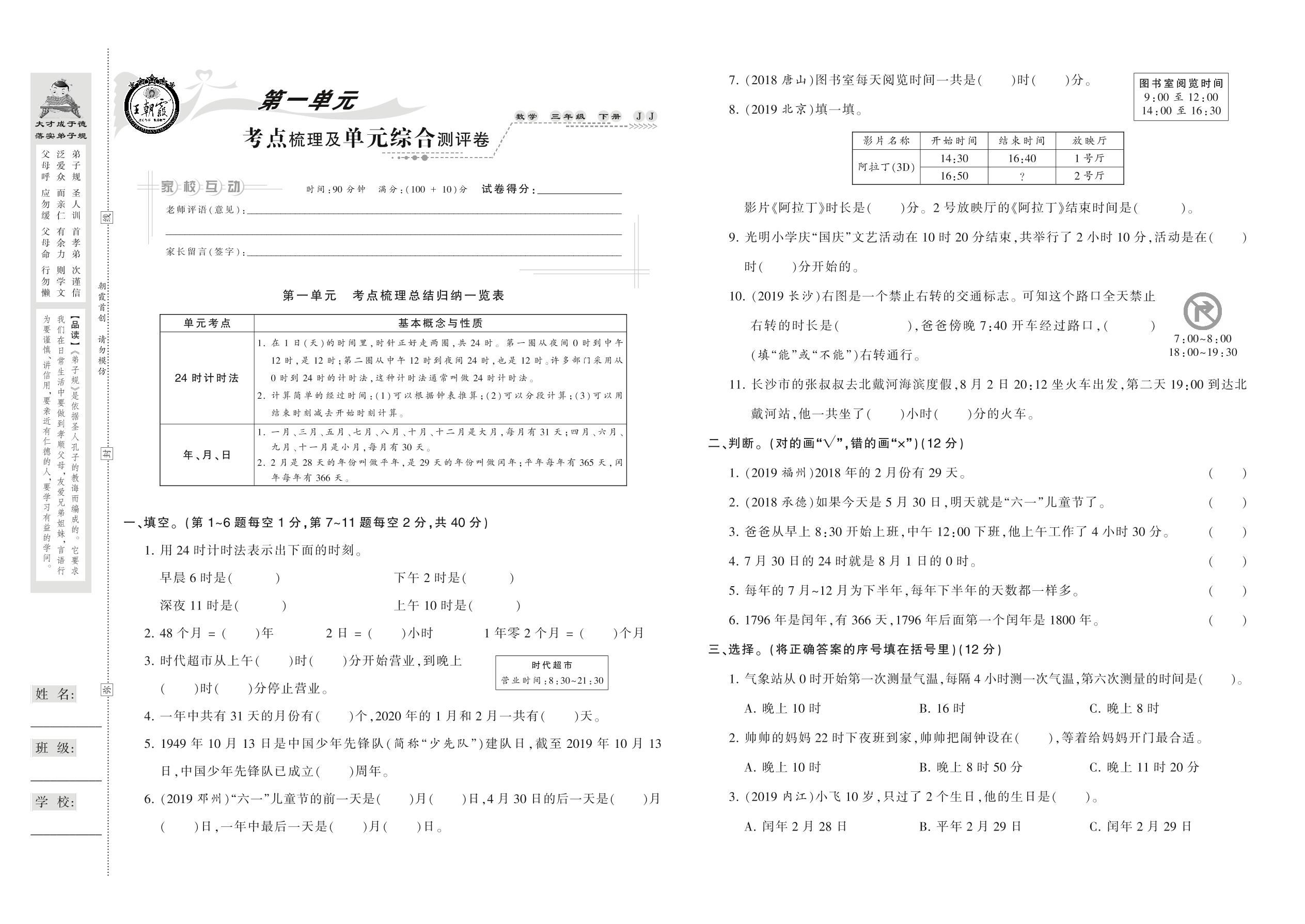 2021下册三年级数学冀教版 第一单元 考点梳理及单元综合测评卷