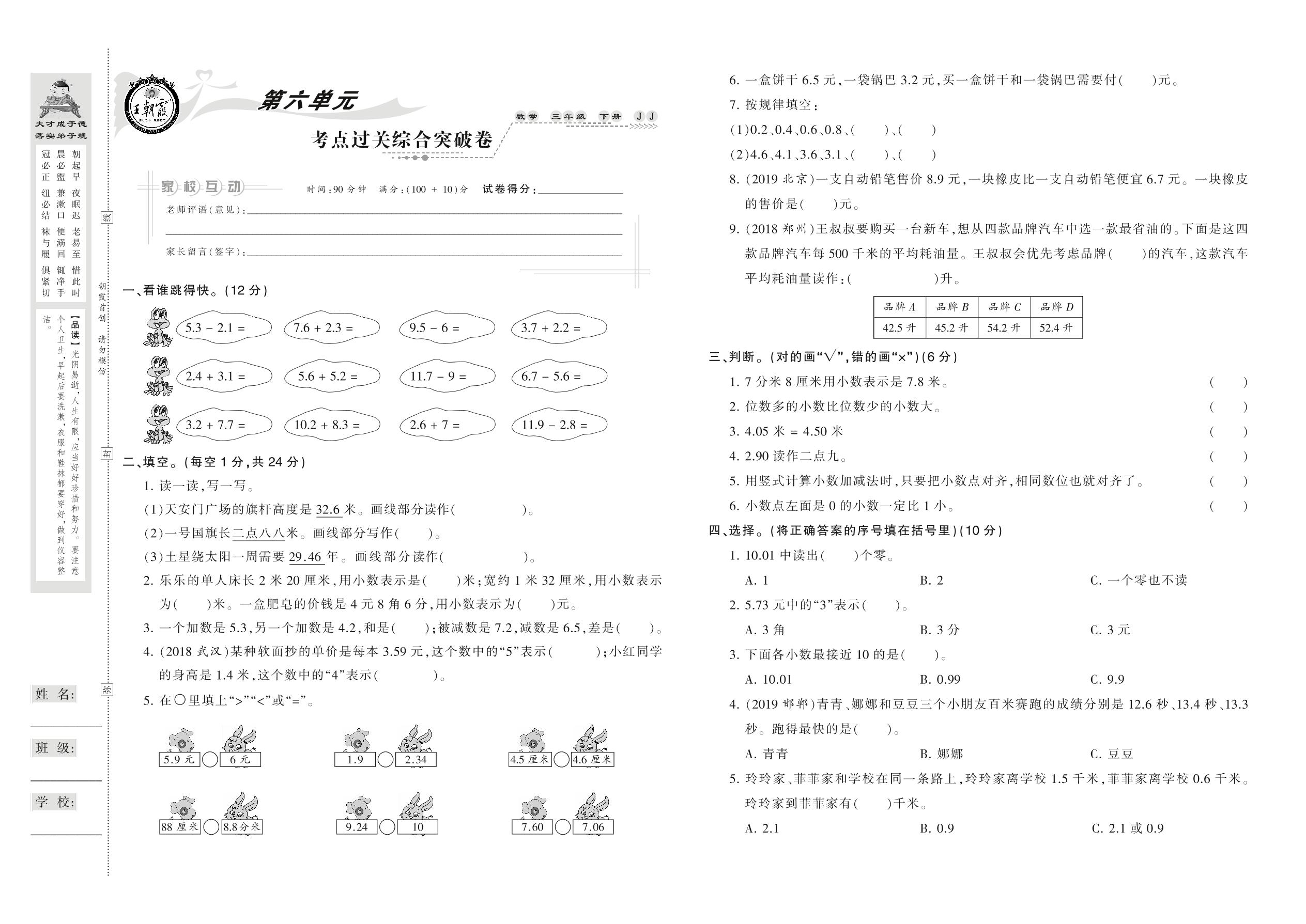 2021下册三年级数学冀教版 第六单元 考点过关综合突破卷
