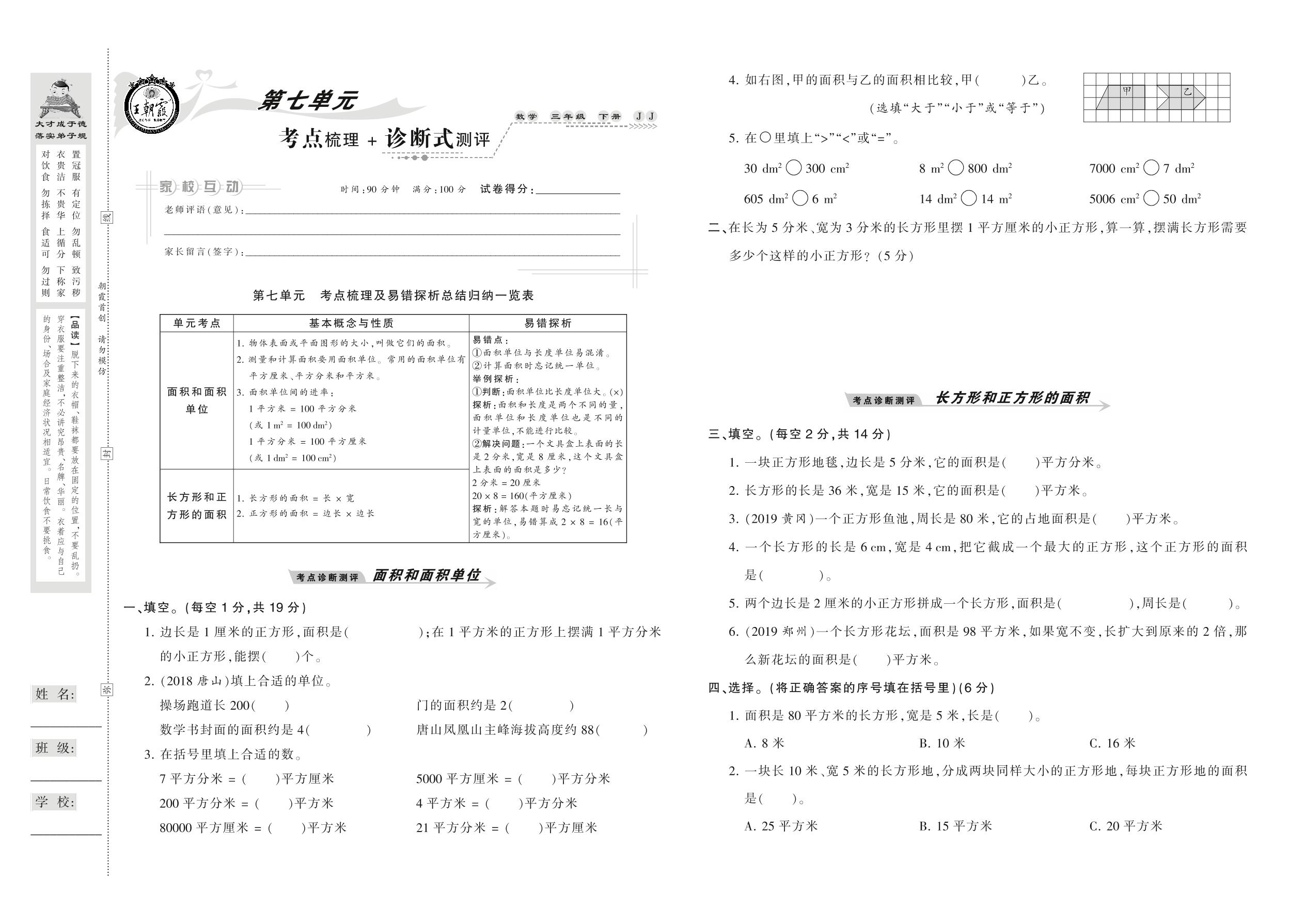 2021下册三年级数学冀教版 第七单元 考点梳理+诊断式测评