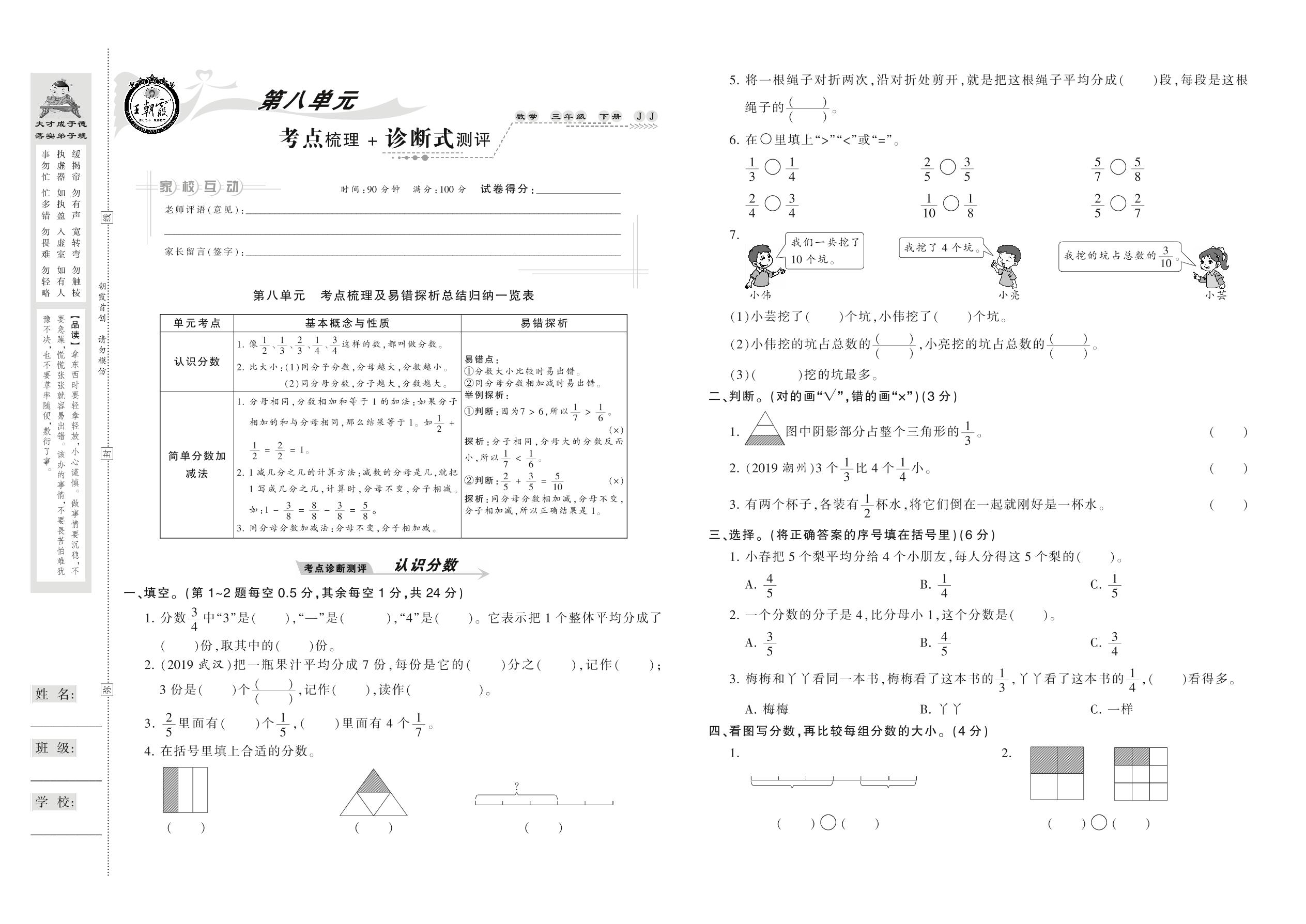 2021下册三年级数学冀教版 第八单元 考点梳理+诊断式测评