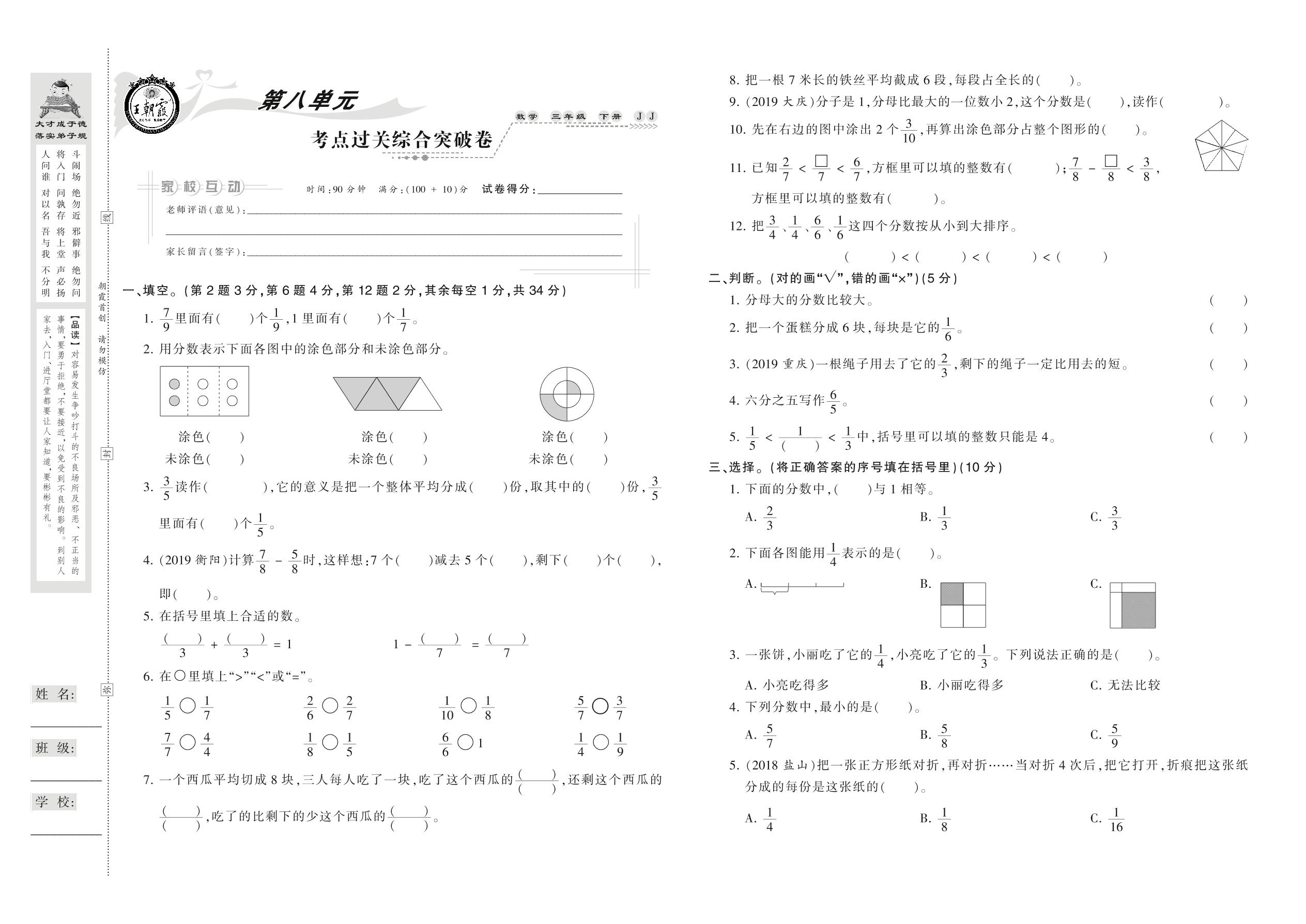 2021下册三年级数学冀教版 第八单元 考点过关综合突破卷