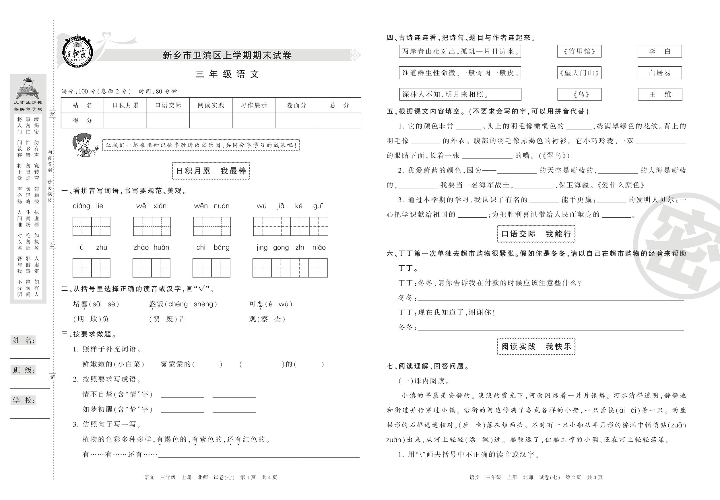 2016-2017学年第一学期新乡市卫滨区三年级语文试卷(北师版)【7】